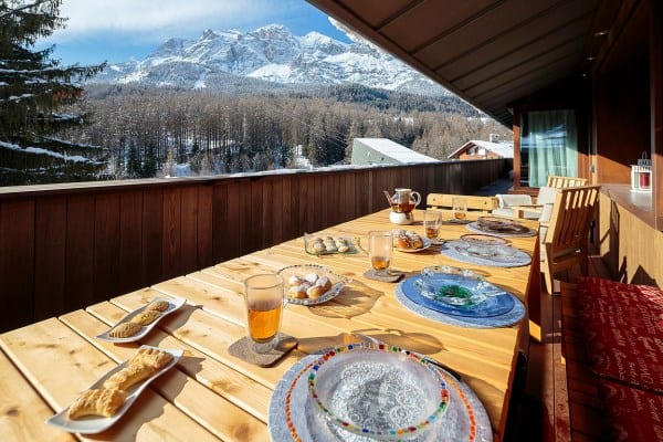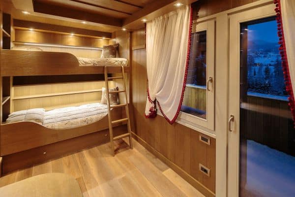 The chalet sleeps a total of 11 guests: 4 adults in two double rooms plus 7 children/adults in 3 additional rooms, on the lower floor. Each room has a distinct style and ranging from bunk-bed room to a deluxe master bedroom suite, with private dressing room. That said, the property can be adapted with flexibility for sleeping configurations for different variety of families. What is fixed is the fact that this is a chalet home, a lovely place to rest, relax and socialise that any family may choose to fully enjoy the best Cortina can offer. The half-covered, south-west facing balcony is suitably furnished for admiring the majestic views al-fresco, relaxing, dining or for an après ski gathering around the wet bar. Inside and below, the well-stocked cellar provides wine for supper and the gleaming wellness sanctuary will certainly entice all to enter into its calm, contemporary and soothing interior for pampering in the sauna, steam room or Jacuzzi bath, or in the games room with a spot of pool. Last but not least, the property also features a separate comfortable staff room, also suitable for the occasional guests, with two beds (bunk) and its own bathroom.