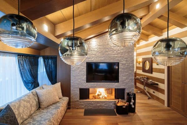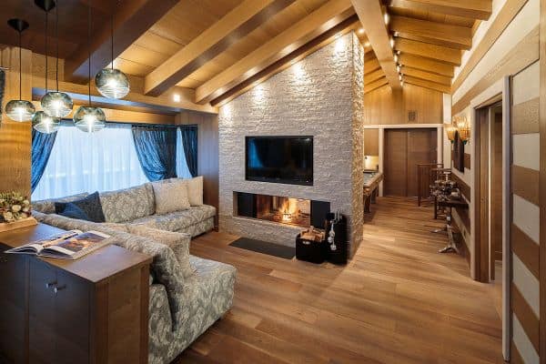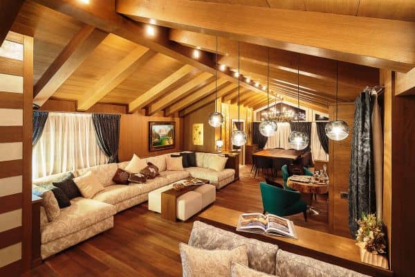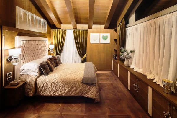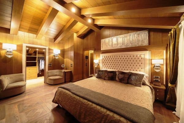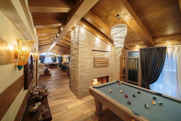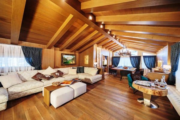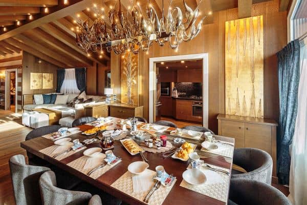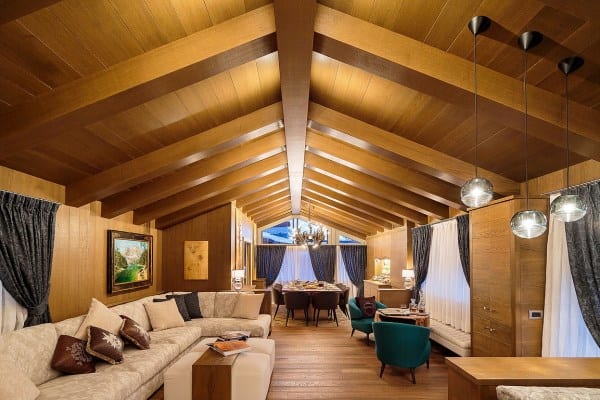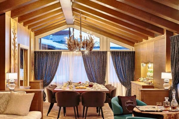 One of the most prestigious of luxury chalets available for rental in Cortina d’Ampezzo is abashed with brilliant views of the four surrounding Dolomite peaks – Monte Cristallo, Faloria, Cinque Torri and Tofane – and conveniently located, just a few steps away from Freccia del Cielo lifts: a rarity in Cortina! If, or when, you don’t feel like skiing anymore for the day, the Queen of the Dolomites’ pedestrianised centre offers the iconic atmosphere of a mountain village, with the addition of a wide selection of luxury brands’ shopping and superb restaurants for the discerning client. Only a short drive from the Austrian and Slovenian borders and 160 km from Venice airport (2 hours by car), ever-hospitable, ever-reliable Cortina’s much heralded local charm is reflected throughout this three-floor property, constructed and designed to present a stylishly modern and a welcomingly woody retreat, graced with arched, vaulted and beamed ceilings. There is also much flourish throughout, enhancing the luxuriously cosy ambience; among these, affectingly embedded discreet lighting to impressive pendulum globes; a corona chandelier crowning the 12-seater dining table in the centre of one the parade of living areas that make up an impressively long and linear, flowing and connected spaces that are lined either side with a succession of windows for looking out on to some of the world’s most spectacular alpine scenery.