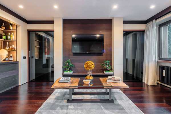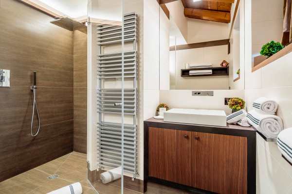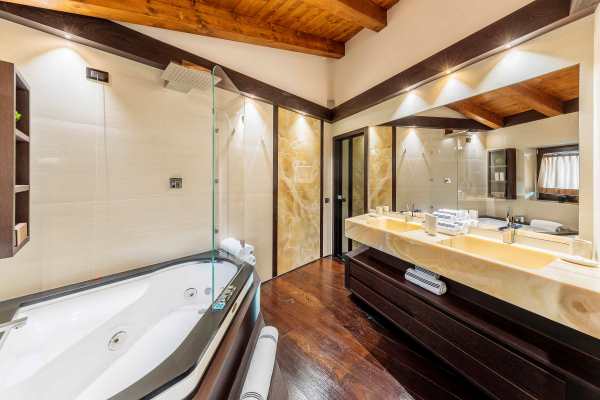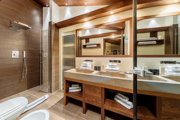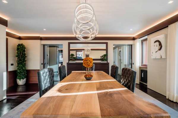 A modern and luxurious chalet is found in a picturesque enclave that is within two hours by car from either Venice or Innsbruck airport. A five-minute stroll for the chalet will take you to either the ski slopes at Cristallo and Faloria or to the centre of Cortina d’Ampezzo; the pulsating centre of this spectacular region’s renown scenic and gastronomic delights. It is a fully independent chalet with a traditional exterior that gives way to an interior designed with fetching contemporary features and harmonious décor utilising the best quality materials, fittings and fixtures. Sleek contemporary wood furnishings and lush upholstery match bright living spaces with discreet lighting. There is also an air of comforting warmth, no doubt helped along by several fireplaces, vaulted, wood-beam ceilings in the upper bedroom suites and polished, dark wood floors. Special mentions also to the gorgeously slick designer spa area – featuring hammam, gym, sauna, heated plunge pool with waterfall and seductive massage area – that is on the lower ground floor along with and sizeable and commodious, high-tech soundproofed cinema. With an interior spread over 760 sq. m, this property is able to boast both a ground floor and a first floor living area; each with fireplace and the latter with access to the wraparound balcony, a wet bar for enjoying at home après-ski, games and television areas kids will enjoy and quiet study for anybody wishing to nestle down with a good book.