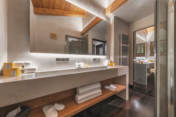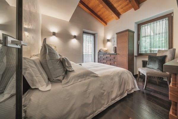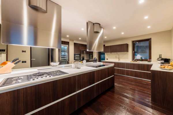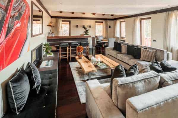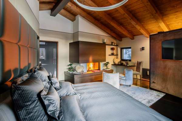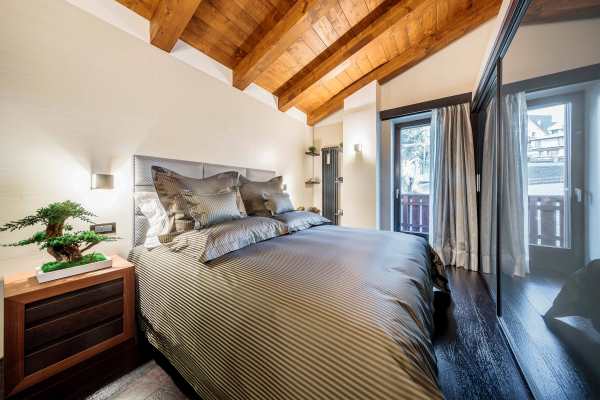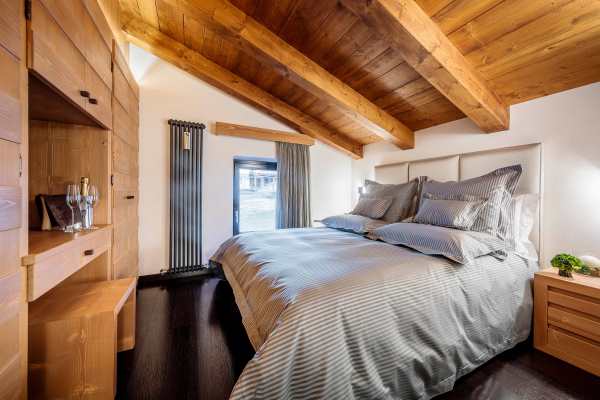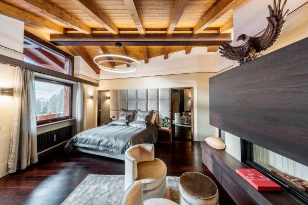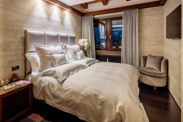 Arranged over 4 levels, the luxury chalet sleeps up to 12 in 6 exclusive bedrooms that are lavishly appointed with the finest linens and designed with walk-in closets, power shower or Jacuzzi bath en suite, rest areas or, as in the case of the delightful upper level king-size master suite, a private balcony. The abundance of space and the gracious comfort provided makes this chalet the perfect “snuggle pad” to fully enjoy easy-free relaxation; whether in the privacy of your own room, or sprawled out on one of the comfy sofas in the living areas or whether catching-up with the latest movies on the big screen. Topping such perfect reward after an energetic day out and about on the slopes will be fine dining, with the delightful accompaniment of notable wines from the property’s well-stocked cellar. Last but not least, this property is next to an equally luxurious twin chalet that can be rented separately to double capacity for larger groups.
