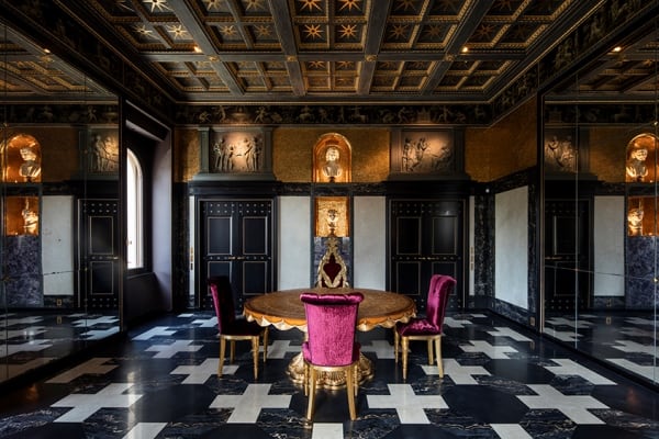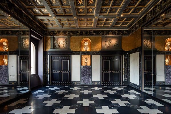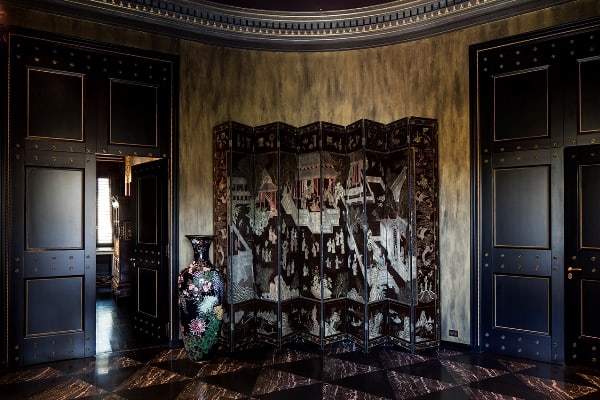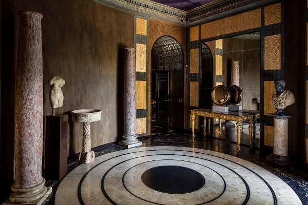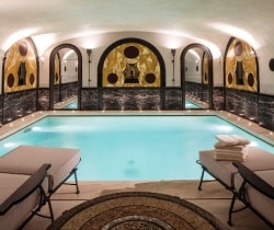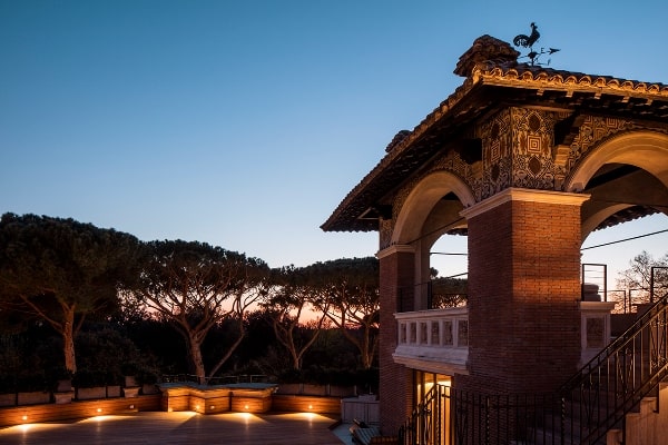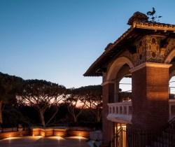 One of the most prestigious private homes in Rome offers astounding surroundings and luxurious comfort located in the quiet and exclusive residential enclave of Parioli, which is the most chic and upscale residential zone in Rome, where there are plentiful boutiques, gourmet stores and beautiful homes. An outstanding entry into the pantheon of exclusive luxury villa rentals, the 750 sq. m Greco-Roman inspired villa is situated across from Villa Borghese; a direct walk of 20 minutes through which arrives at the Piazza del Popolo or at the top of the Spanish Steps. Recent renovations to the most exacting and highest of standards presents an immaculate villa that honours and retains the original characteristics; a restoration of admirable style and a quality of décor with flourishes of artistry in the details and finish. The villa presents a feast for the eyes and luxurious comfort include a double – height and frescoed ceilings, windows and glass mirrors, elaborate walls specially painted by artists along with trompe l’oeil and etched panels, intricate and gleaming marble floors, golden mosaics, original and Greek sculptures, Chinese porcelain, objets d’art and elaborate painted screens. Within the rich, opulent ambience there is a plush velvet of the living room or the well-stocked library. Dining can be specially formal in the grand dining room, while guest may also greet the day under the high rotunda of the breakfast room or enjoy a snack or chef’s taster’s menu in the ample and professional designed kitchen. There is also an uplifting and admirable roof terrace (250 sq. m) for yet more heightened luxury. Fitted with banquettes and discrete lighting, the terrace provides a magical and elevated scenic views across the city for al fresco relaxation, dining and entertainment.