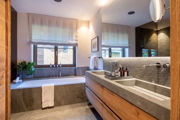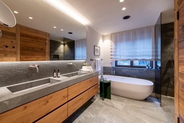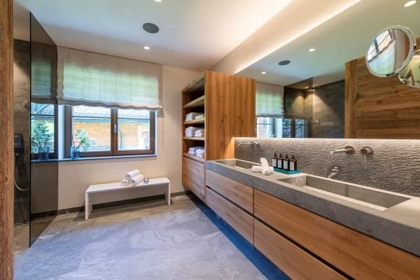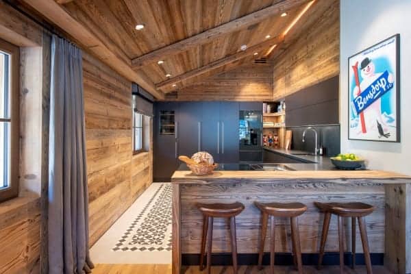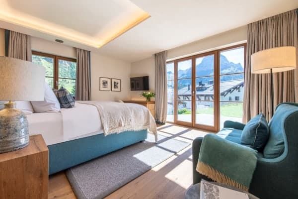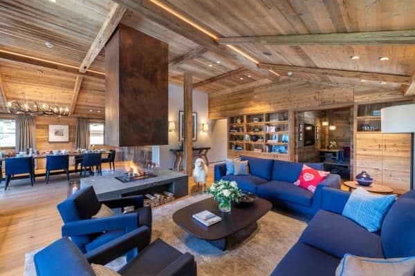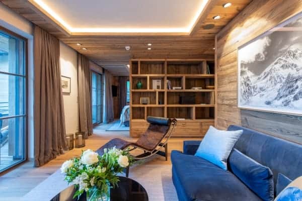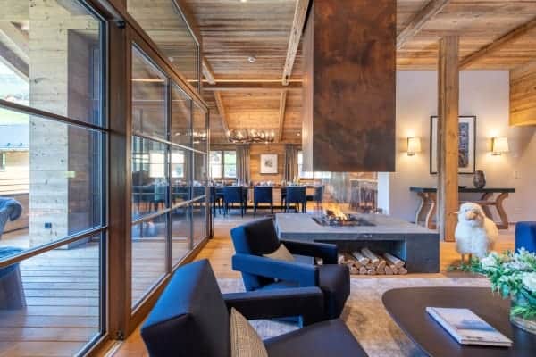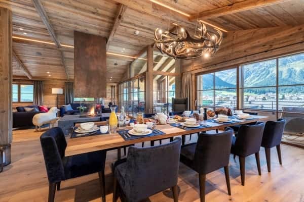 The contemporary luxury chalet stands within a new and highly sought-after residential development and represents a fine example of how slick modernity and alpine traditions can be combined to create a luxurious residence. The property is close to the slopes, ski lifts and a ten-minute stroll from the centre of Lech, which shares a local ski area with neighbouring Zürs that forms part of Austria’s largest ski area covering five hundred kilometres of ski and off-piste slopes. The resort, a firm favourite destination of royalty over the years, was the first European resort to cap the number of day passes and, subsequently, remain relatively tranquil and uncrowded. The standalone chalet immediately grabs the attention by its scrubbed timber plank floors and beam and vault ceilings construct that pays homage to the traditional mountain home. The interior design displays lavish attention to detail and takes full advantage of the double-height ceilings with an open plan living arrangement spread across the top floor of the chalet. The neutral palette of décor warms in the natural light of day and ambient night lighting and is emboldened by the bright blue upholstery of bespoke sitting furniture. The centrepiece glass-fronted fireplace with its copper flue reaching the ceiling is a stunner, as the-expansive slide glazing that forms a see-through partition to the covered and recessed outdoor terrace on the main balcony. In addition, there’s a super cosy and comfortable TV room that can be partitioned from the main living space and which makes a particularly cosy retreat for children. The main entrance is on the ground floor along with the impressive wellness area with sauna and hammam. From there guests also have access to the large communal indoor swimming pool, the large fitness area and relaxation lounge with bar within the luxury and lounge bar for the exclusive use of within this unique luxury development.