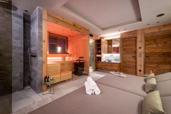 Consisting of 400 sq. m and spread across 4 levels served by elevator and staircase, the detached chalet sleeps a capacity of 12 and has 6 luxurious, colour-themed bedrooms en suite that are distributed over the middle floors of the chalet. These include a master bedroom boasting an impressive walk-in wardrobe, velvet sofa lounge, balcony access with en suite freestanding bath and separate rain shower, as well as a modern carved-wood bunk room ideal for 2 kids. Enjoy the beauty of the scenery from within or outside on, the fully-furnished terrace on the balcony, which offers an invigorating setting and stylish comfort for breakfast whilst basking in the morning sunshine, or with an aperitif in hand to watch the glow of dusk fall across the mountains and the resort. Later on, for more indulgent relaxation and to pamper body and soul, there is the delightful retreat of the private wellness area to look forward to.