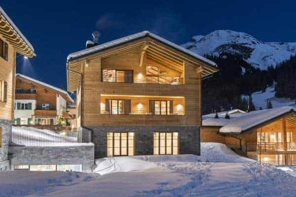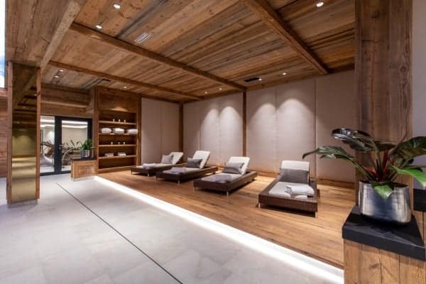 The contemporary luxury chalet stands within a new and highly sought-after residential development and represents a fine example of how slick modernity and alpine traditions can be combined to create a luxurious residence. The property is close to the slopes, ski lifts and a ten-minute stroll from the centre of Lech, which shares a local ski area with neighbouring Zürs that forms part of Austria’s largest ski area covering five hundred kilometres of ski and off-piste slopes. The resort, a firm favourite destination of royalty over the years, was the first European resort to cap the number of day passes and, subsequently, remain relatively tranquil and uncrowded. The standalone chalet immediately grabs the attention by its scrubbed timber plank floors and beam and vault ceilings construct that pays homage to the traditional mountain home. The interior design displays lavish attention to detail and takes full advantage of the double-height ceilings with an open plan living arrangement spread across the top floor of the chalet. The neutral palette of décor warms in the natural light of day and ambient night lighting and is emboldened by the bright blue upholstery of bespoke sitting furniture. The centrepiece glass-fronted fireplace with its copper flue reaching the ceiling is a stunner, as the-expansive slide glazing that forms a see-through partition to the covered and recessed outdoor terrace on the main balcony. In addition, there’s a super cosy and comfortable TV room that can be partitioned from the main living space and which makes a particularly cosy retreat for children. The main entrance is on the ground floor along with the impressive wellness area with sauna and hammam. From there guests also have access to the large communal indoor swimming pool, the large fitness area and relaxation lounge with bar within the luxury and lounge bar for the exclusive use of within this unique luxury development.