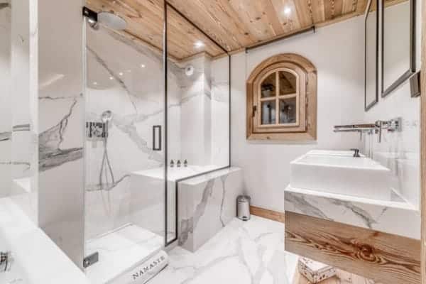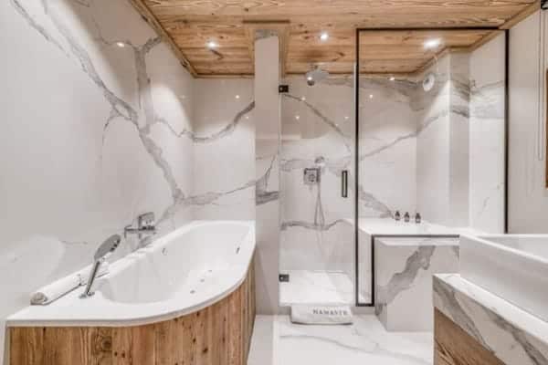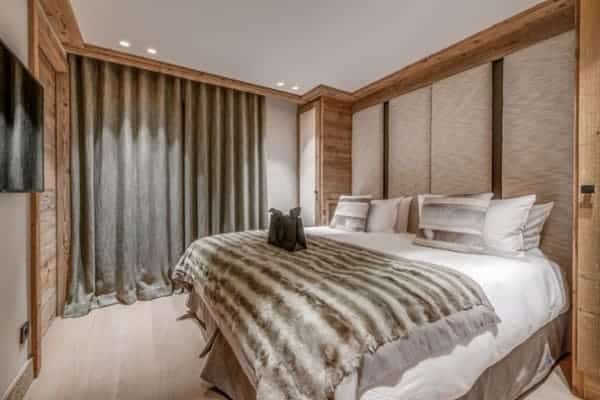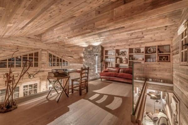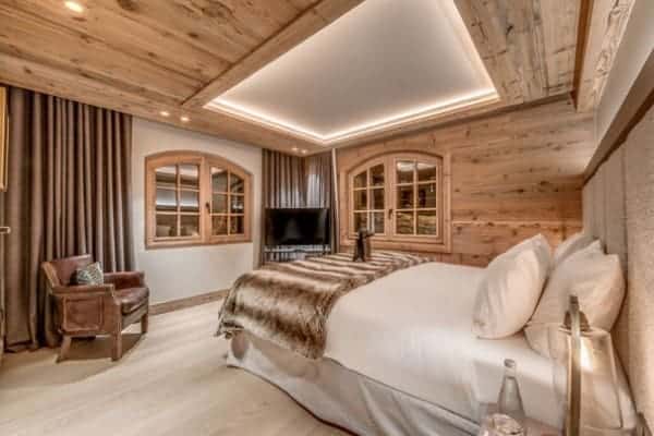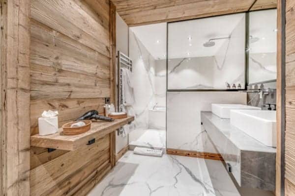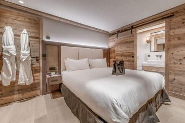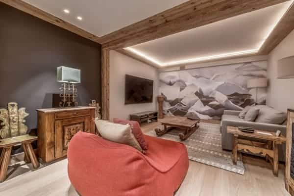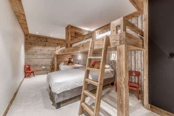 The prestige chalet encompasses 400 sq. m of living space expertly distributed across 4 levels is designed to accommodate between 12 to 14 (ideally 8 adults and 4 children) in 6 bedrooms – including a spacious children’s bunk room – with en suite bath or Jacuzzi and an additional but smaller and windowless double bedroom en suite that may be suitable for staff or older children. The kid’s suite adjoins a glass-fronted television lounge/games room – effectively a mezzanine over the spa and pool area – that offers a delightful play space that is a bonus for parents to keep their eyes on the youngsters. The top floor living area is the perfect setting in which to gather for après ski drinks around the fireplace before adjourning for a delicious supper in the intimate dining area looking out to the mountains. The offerings for extra pampering and relaxation within the delectable spa downstairs will entice all who enter. Elsewhere, the main terrace is a delightful spot for delectable breakfasts outdoors, bathed in the morning sunshine and a romantic end of day nightcap looking out on to the moonlit Alps.