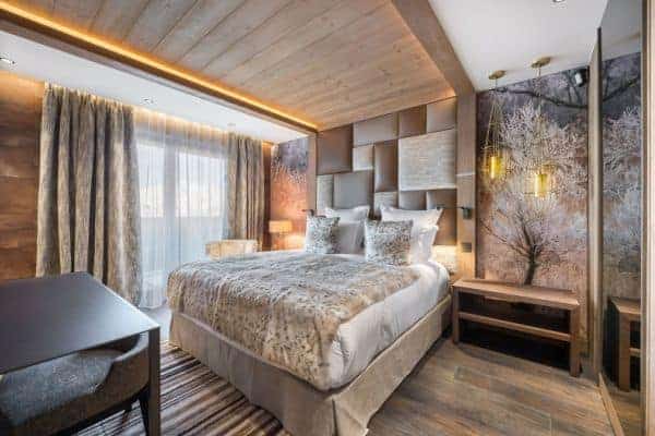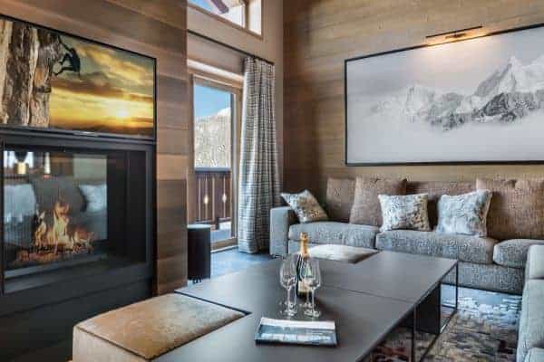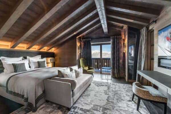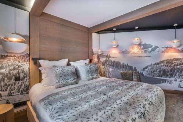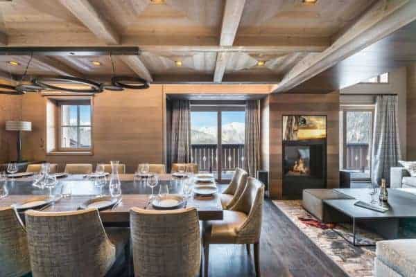This most contemporary chalet embraces a traditional setting to provide a gloriously luxurious and gorgeously refined ambience that embraces with great aplomb, not only its mountain setting, but also its unique location in Cospillot, which is the heart of Courchevel 1850 and is enviably close to the centre, slopes and ski-lifts. The property benefits significant from having easy access to the Three Valleys ski network and the one hundred and fifty kilometres of local slopes served by multiple lifts. As the chalet is a short stroll from the hub of one of the world’s most glamorous ski resorts, any non-skiing guest adore the vicinity and access to any amount of activities to enjoy away from the slopes. These include luxury retail therapy, helicopter rides or Paragliding or mountain biking and indoor bowling and ice skating. The main entrance hall of the chalet is on the same level as a ski room with boot heaters garage with ample parking several vehicles. Higher up within this bright, fresh and spruce luxury property is the large and open-plan sitting and dining room areas, with large fireplace and full-height glazed openings out onto a sizeable balcony terrace from which to enjoy the scenic mountain views in the fresh air and private. Inside, the classy décor by a renowned interior designer basks in cool and neutral colours, luxurious fabrics, sleek timber floors, beamed and vaulted ceilings and modern-day frescoed walls comprising digital prints of local alpine life.