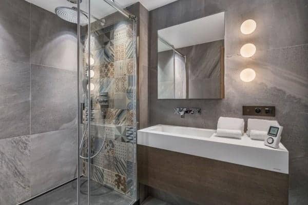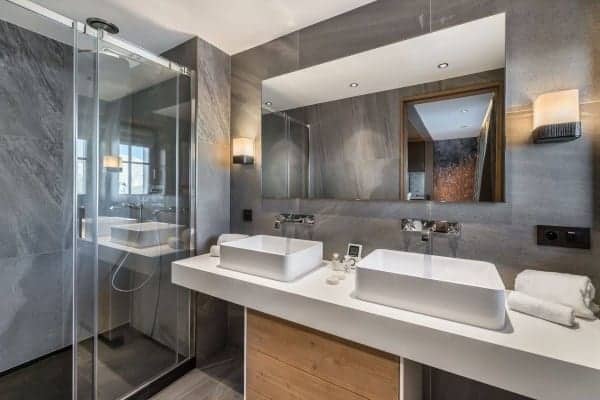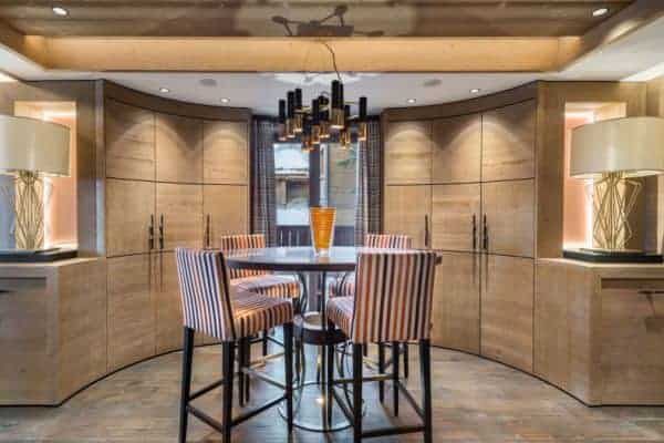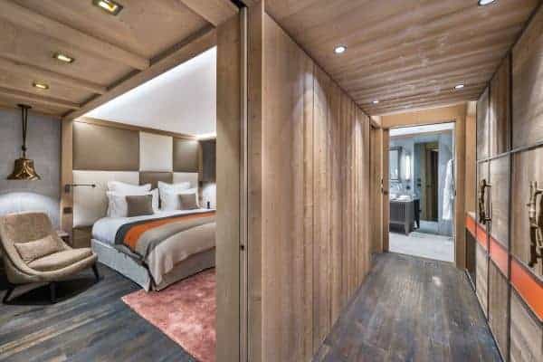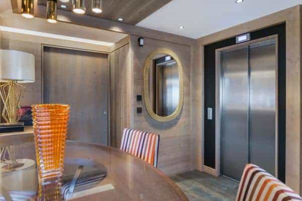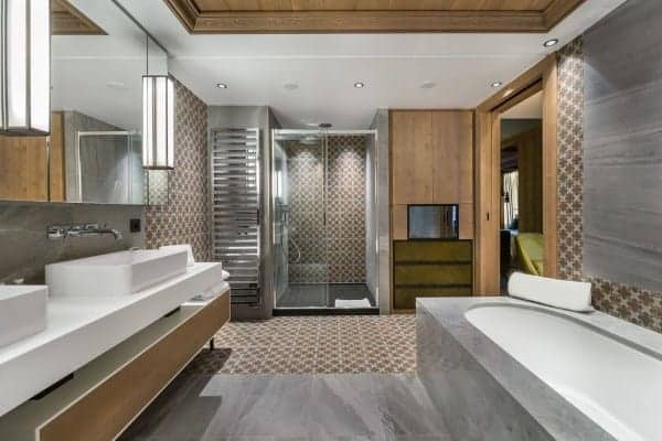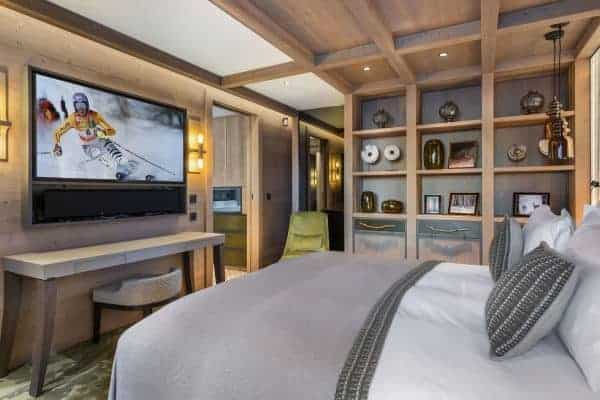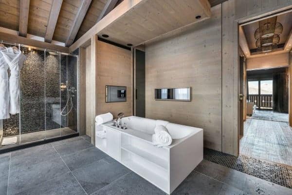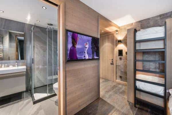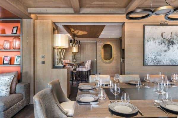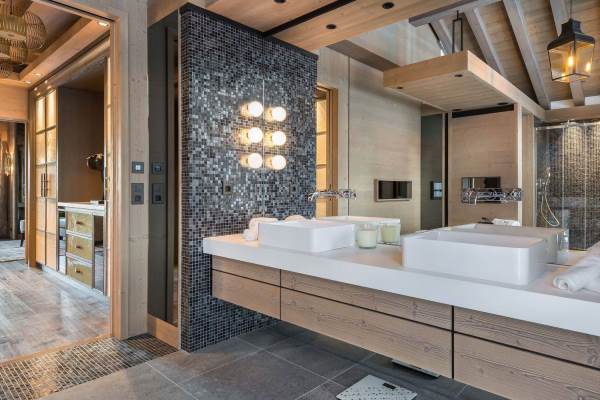 There are 6 très chic bedrooms en suite – the majority of which on the first floor and includes a bunk room for 4 children – is expertly designed chalet to accommodate a total of 14 guests in a luxurious setting spread over an impressive 900 sq. m across 5 levels. An internal lift serves all floors, with the expansive and seductive master suite at the top. Each suite features a spa-themed bath or shower room, emulated by the deluxe ‘at home’ spa on the lower of the living area floor of the chalet. This wellness and relaxation nirvana includes an indoor swimming pool, Jacuzzi, hammam, sauna and massage room, alongside a bar/lounge that overlooks the pool, a well-stocked wine cellar and a ritzy home cinema room set with a tier of long and plump sofas. It is an oasis for unwinding in private after a day out on the slopes, as well as a superb après-ski hangout in which to entertain and have fun.