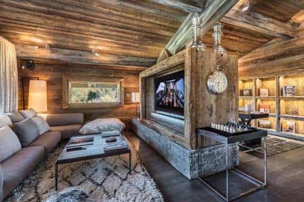 This spatially generous chalet has the capacity to accommodate 14 guests – 10 adults and 4 preteens – in great comfort in a total of 6 distinct and luxurious bedrooms that include two master suites (one on each of the upper levels), a bunk room for the kids and en suite facilities juxtaposing glass, wood and marble complimenting the tranquility of these private sanctuaries composed. The mellow design and arrangement of the living area offers plenty of scope for restorative, private relaxation, as well as sophisticated socialising. It is a lovely and enticing ambiance in which to stretch out on one of the long sofas around a glowing fireplace after coming back from a day of exertion out on the mountains, not forgetting the added bonus of those other fantastic recreational spaces below.