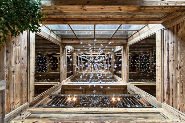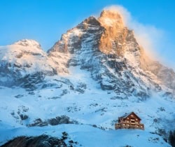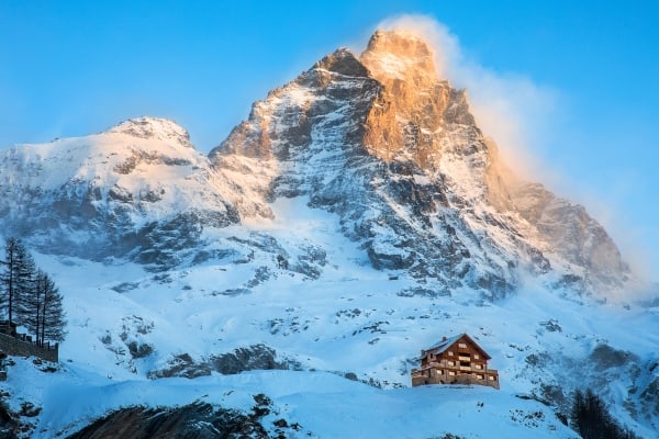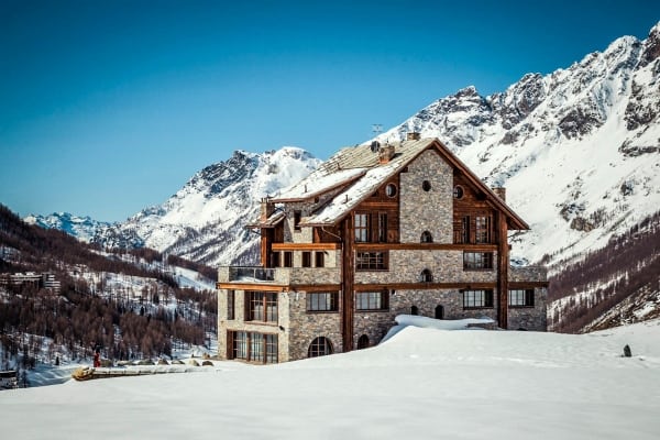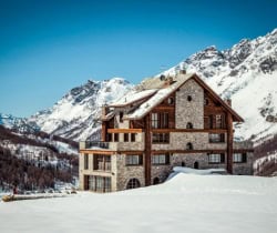 The view across the Aosta Valley is spectacular from one of Italy’s finest chalets that stands alone in splendid isolation on a leeward slope of the Matterhorn (Monte Cervino); a ninety-minute car drive from Turin airport and one hundred meters above the ski resort of Cervinia. Due to an elevation of two thousand metres above sea level, the resort is one of Italy’s most ‘snow-sure’ ski destinations. Local slopes are popular with beginners through intermediate-level skiers and for more experienced skiers; there is access to an additional network of four hundred kilometres of slopes that includes Zermatt in Switzerland, using the available international lift pass. The delightful, modern property re-imagines the traditional alpine chalet and, by location, assures utmost privacy and awesome views. The property, composed of mountain rock and embellished with a variety of numerous wood-frame windows, benefits from natural light that reaches every corner within and creates a bright but warm ambience. Exposed stone, utilised for feature walls and the central fireplace is a key component of the interior décor. Others include touches of opulence, such as a mirror ceiling in the living area lounge and the chandelier that hovers above the entire length of the fourteen-seater dining table. Another dazzling display is the Swarovski cascade of lights, which dangle from the rafters down through all upper levels of the open atrium. Premium five-star amenities include a fitness room, cinema room, games and television areas as well as an excellent spa refuge; a huge wellness area and oasis luxuriant with gleaming marble and glass, sauna, hammam and a large indoor swimming pool that is lined by full-length glazing along two sides to capture the scenic beauty outside.