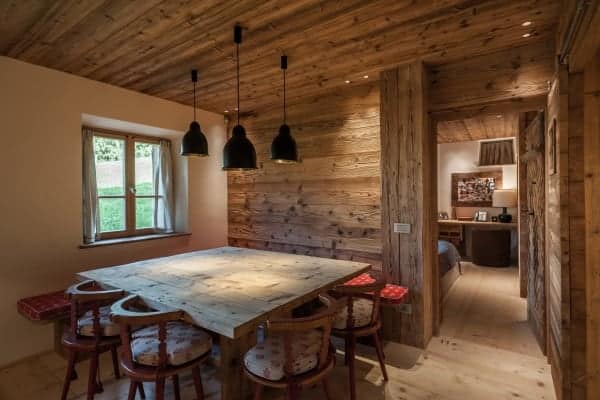 Cortina d’Ampezzo, the “Queen of the Dolomites” has in her very heart a resplendent chalet just a few steps from the pedestrian centre of this beautiful village. Live in the lap of luxury at Italy’s premier mountain resort, in the heart of the Dolomites, one of the unique regions in the World offering a memorable scenic and cultural experience for all seasons. In Summer the area is a magnet for climbers and trekkers alike and in the Winter the resort is an eminent part of the Dolomiti Superski: one of the largest ski carousels in Europe comprising 12 ski areas, 450 lifts and more than 1,200 km of white slopes. A lengthy renovation effort that started from an old barn has created what is arguably the best private luxury chalet in town and that is available to rent. There is a relaxed ambience to this warm and woody chalet, which benefits from an adaptable arrangement of living and private spaces. Deep and plush furnishings, warm, muted colours and lavish throws harmoniously offset the scrubbed wood walls and floors. Discreet lighting plays its part too to add dramatic elements and surprise, from the kitchen and living areas to the bathrooms and bedrooms. Shafts of natural light from outside and within stream into the stylish interior, which presents a cocoon of comfort within which there are exposed and featured stone walls, an enclosed glass forest and ornately carved and eye-catching interior windows. A generous indoor swimming pool and a compact high-tech fitness area are other unique features and located within a very comfortable and classy spa designed for luxurious rest and pampering in secluded bliss.