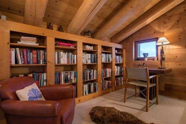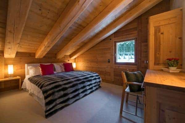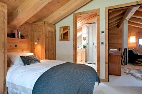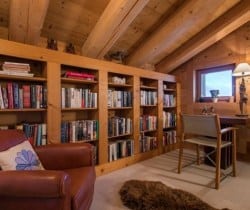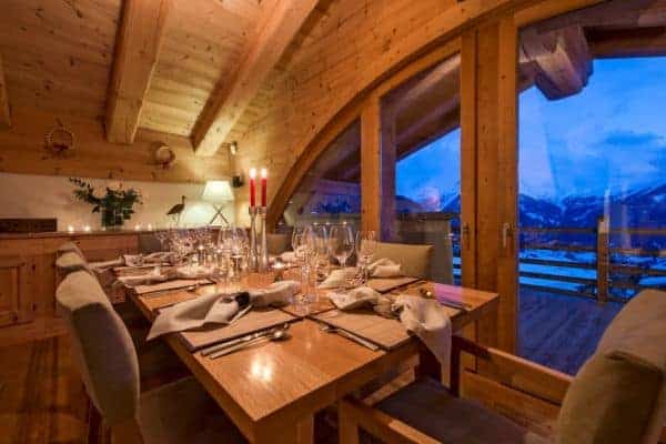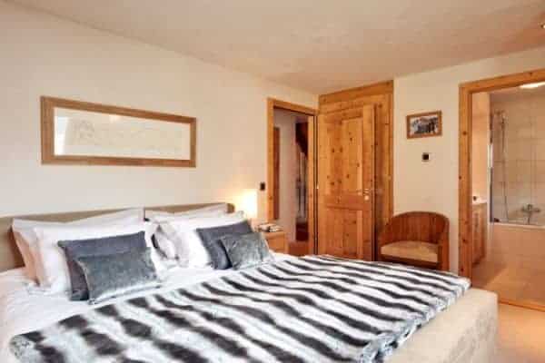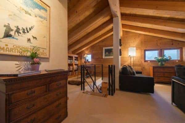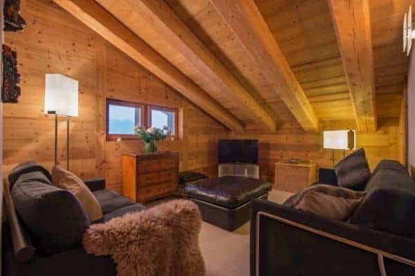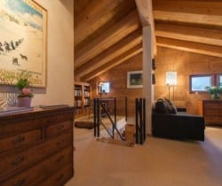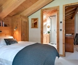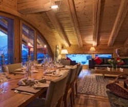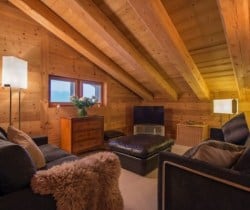 Located on an elevated south-facing position between the Savoleyres lift station and Les Moulins nursery slope, this luxury penthouse apartment feels more like a free-standing chalet than an apartment. The wood-panelled living room is decorated with elegant furnishings and dominated by a fabulous central stone fireplace, while the striking half-moon French windows open on to a balcony from which one could enjoy breathtaking views of Verbier and the panoramic mountain ranges beyond. Beamed ceilings, wood and light colour tones characterise the apartment where also grey plays an important role throughout, in the fabrics of the sofas, the dining chairs, the bedspreads, matching the grey stone of the fireplace.