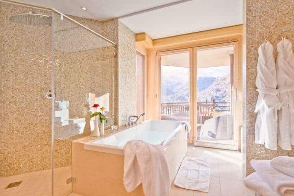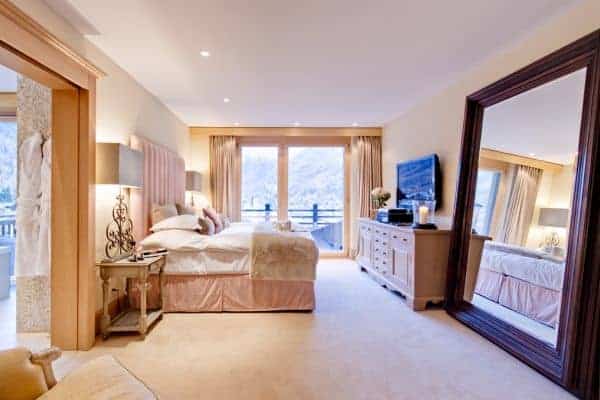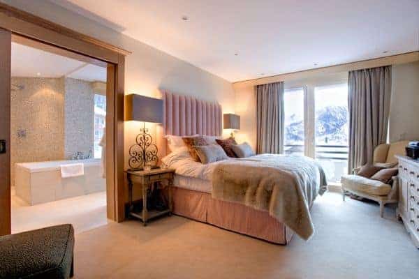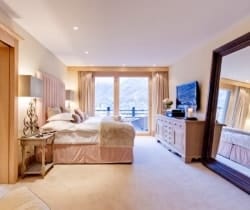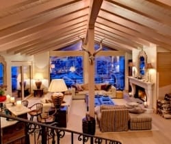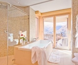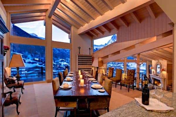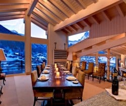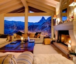 Built on a south-facing hillside in the exclusive Petite Village area of Zermatt, a sumptuous and luxurious chalet captures, from its balconies and huge windows, the breathtaking scenic views of the Matterhorn and surrounding mountains. Designed and constructed to the highest standard with floor to ceiling windows on every of its three floors, it offers a dramatic vaulted, beamed interior. Sophisticated furniture and design lamps are only some of the features it enjoys; large spaces throughout, wooden floors, white walls, elegant fabrics and warm rugs, all play a central part in the open plan living area which exploits its double height to accommodate, cleverly, the dining area and kitchen on a mezzanine open floor.