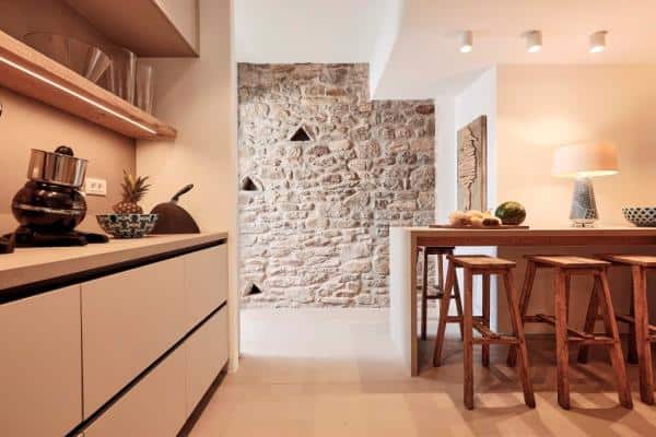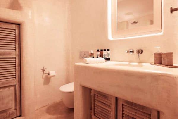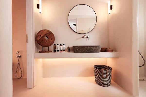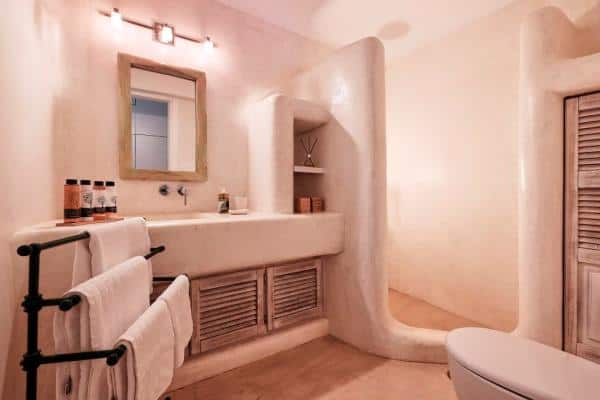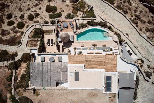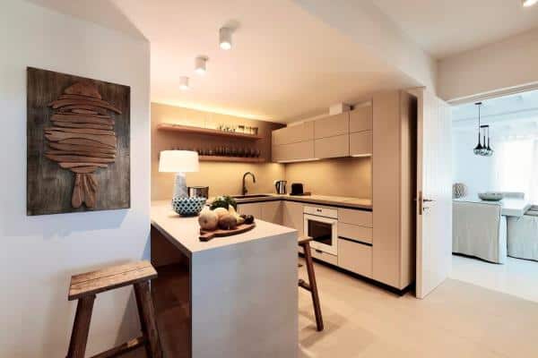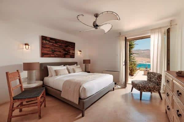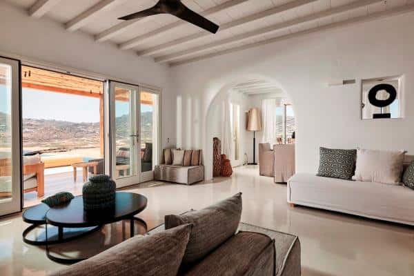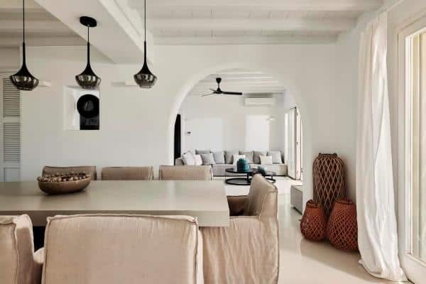 The Villa is situated on two levels, with an outdoor lounge and a dining area which is naturally shaded from the bright, midday sun. The villa is an elegant interpretation of traditional Greek architecture, finished with a mix of artisanal stone masonry and sweeping, white-washed walls. The sympathetic curves and summery palette continue inside the property, where the spacious rooms are adjoined through elegant white archways, and touches of lightly-coloured wood provide detailing in the beams, ornamentation and furniture. The addition of some tasteful art and decor results in a well-balanced mix of both simplicity and opulence.