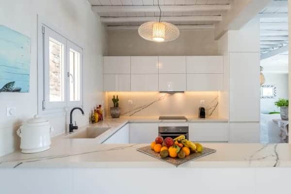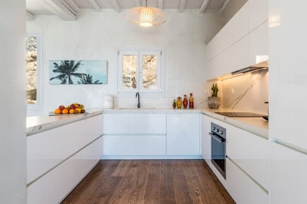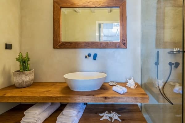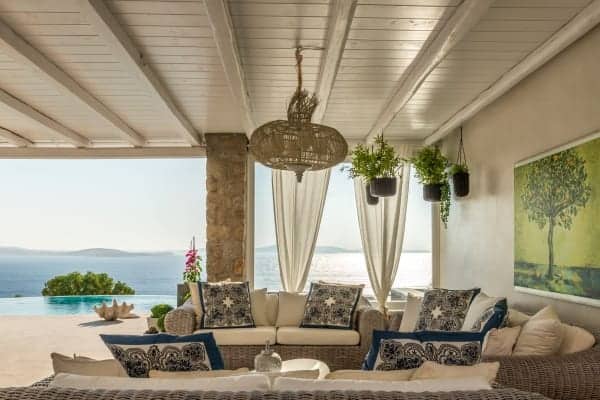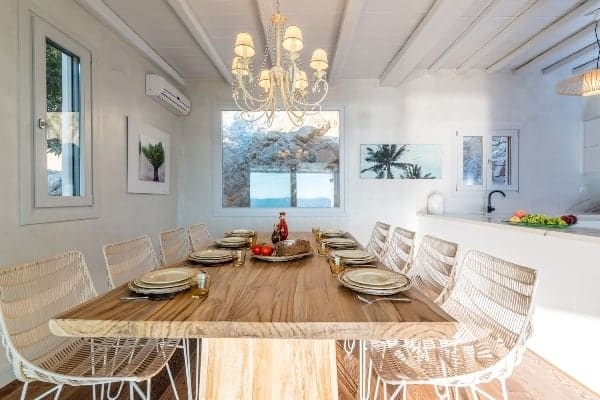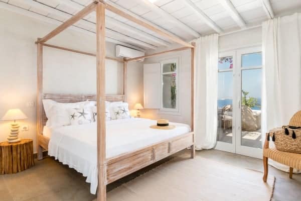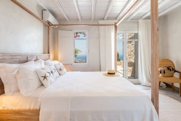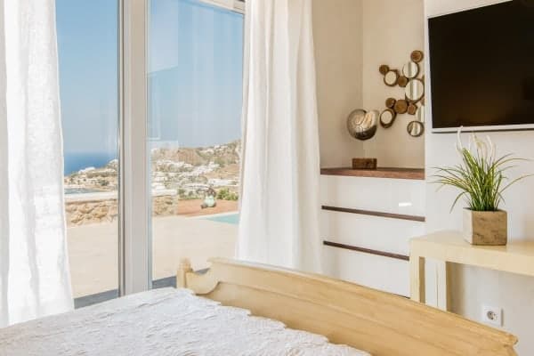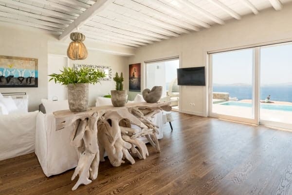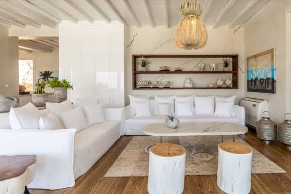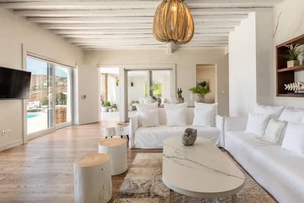 The Villa itself is perfectly located just 300m away from the Agios Ioannis beach, and 3.5 km from Mykonos town, ensuring both convenience of location and the right amount of isolation and privacy. The interior has a large living room and open plan kitchen, six double bedrooms (five of them en suite) and can comfortably host twelve guests. Rooms have a light, celestial feel and feature beautifully-finished wooden flooring and beams.