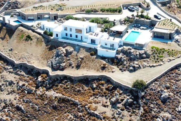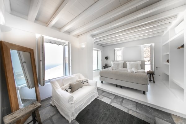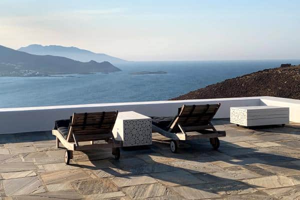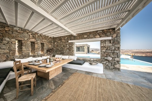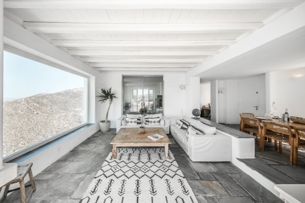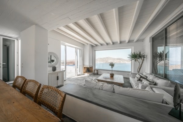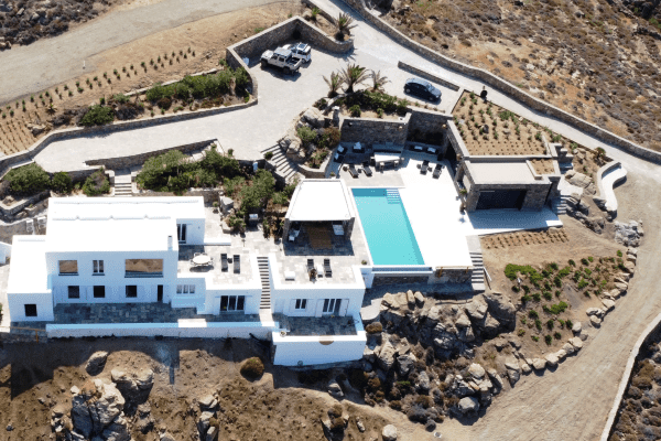 The sparkling and luxurious villa boasts an unobstructed and an unrivalled view across the mythical waters of the Aegean Sea. It is eight kilometres from the town as well as relatively close to several of the island’s loveliest beaches stands a mere three hundred metres from the seashore. This whitewashed property is in an enviable position and on a part the island that is blessed with the constancy of cooling sea breezes. The ethos of building seems to have been to employ the use of local materials and assimilate the property to the surrounding landscape. This has been wholly successful, on a grand scale with an air of timelessness, assisted by with the squared-rectangular dimensional construction and design underpinned and contrasted by exposed stone stairways and walls, both inside and out, paved flooring, high vaulted timber ceilings and huge viewing windows cut with precision out of the dense, cooling stone walls. There are also glazed panels that slide open out on to one of the various and multi-level terraces from the bright and airy interior. The décor embodies elegance and modern rustic simplicity. The spacious living area opens to extend out onto an expansive terrace and the villa has sizeable terraces that include the infinity swimming pool and sprawling sun decks, a covered dining area and a lounge for you to dive and sink into the enthralling sea view whilst you relax. Accompanying your thrilling view vista will be a commanding sense of tranquillity and an abiding feeling of exclusivity.