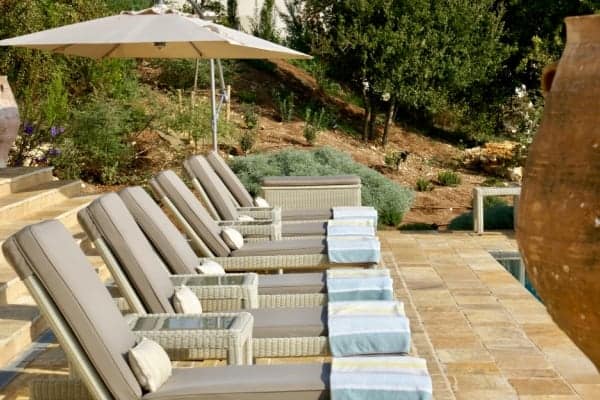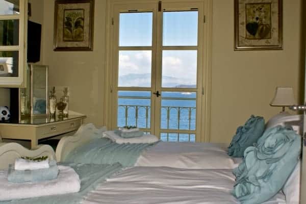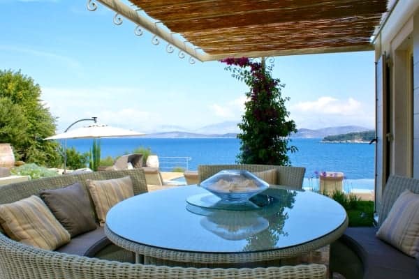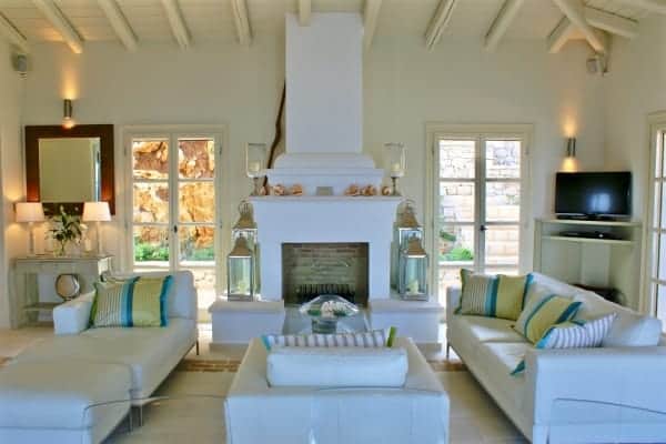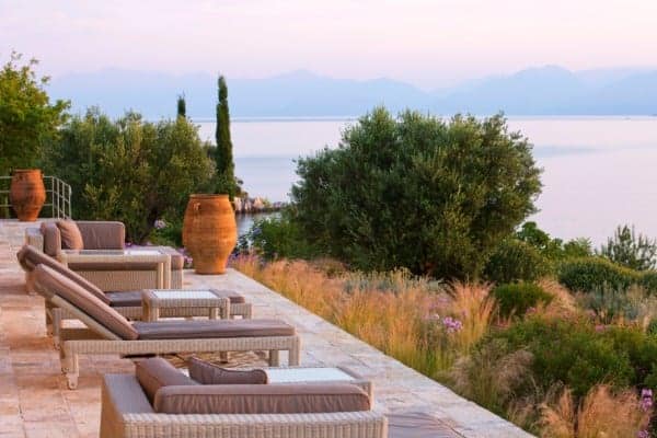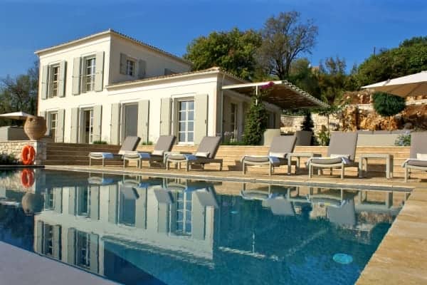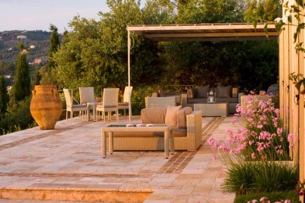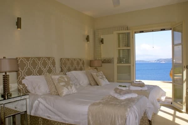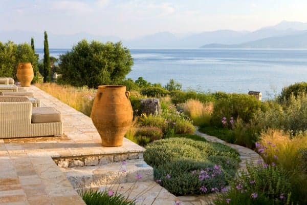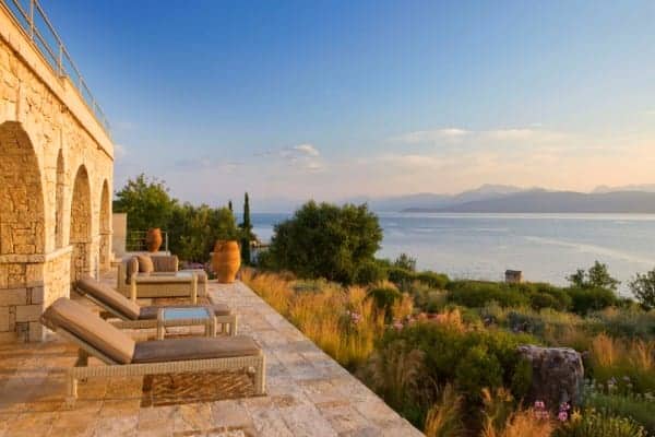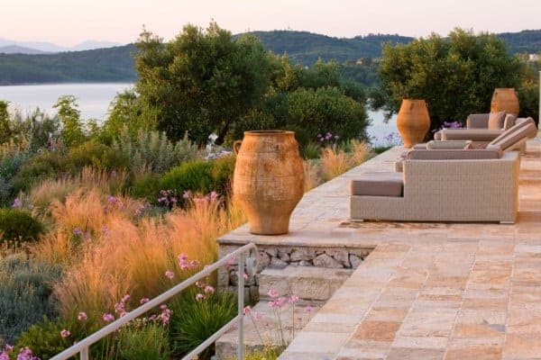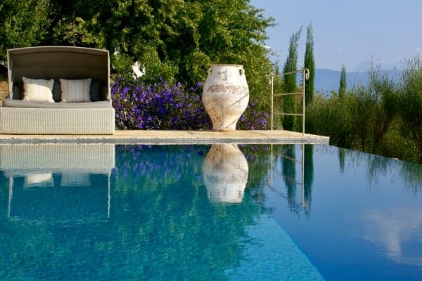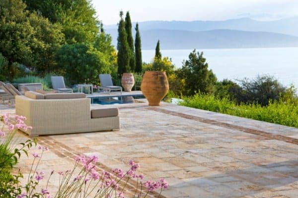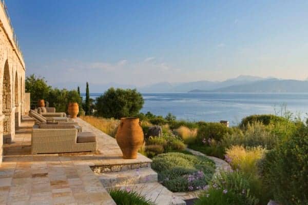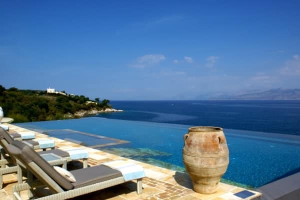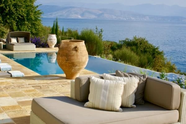 Cool creamy tiles, leather framed mirrors and a selection of wooden nautical antiques are just a few of the impeccably thoughtful decorative adornments that grace this completely new villa. French doors in living and bedroom spaces allow a floor to ceiling grandiose view of the startlingly blue Ionian Sea. Throughout the open plan interior spaces is the theme of muted, subtle, thoroughly comfortable colours and furnishings culminating in a refreshingly high beamed ceiling. Flagstone terraces border the infinity pool decorated with enormous antique terracotta pots, their stately presence a reminder of earlier times, in stark contrast to the more modern appeal of the villa. Surrounding the pool are abundant plantings of flowering bushes, providing a sweeping display of attractive native plants.