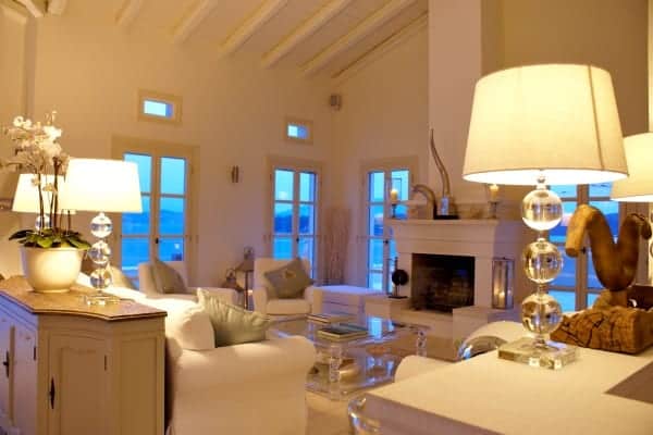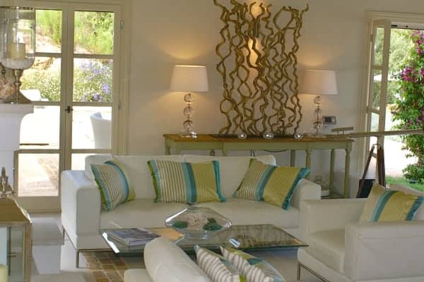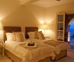 Within the entrance courtyard water features softly babble and comfortable seating areas nestle among the ancient Olive trees and Moroccan accents. The beamed ceiling, walls and furnishings envelope one in creamy colours, taupe accents and pale flooring to create a modern, yet soothing appeal. A serene Buddha sets the mood for the summer kitchen and expansive outside terrace, with uninterrupted views of the sea.
