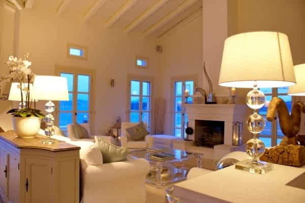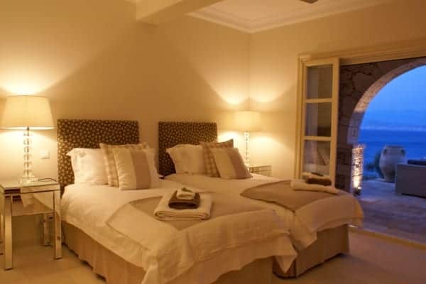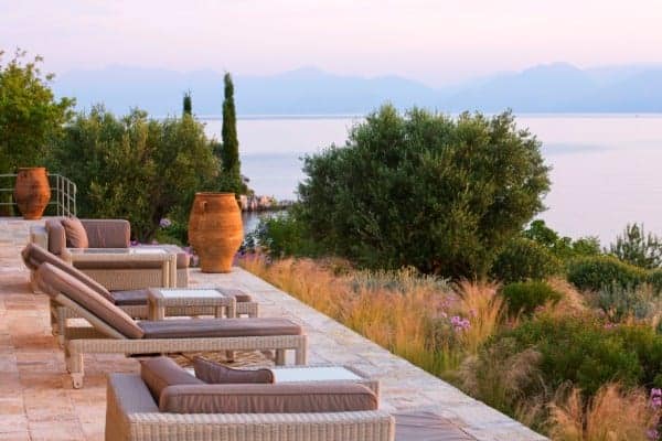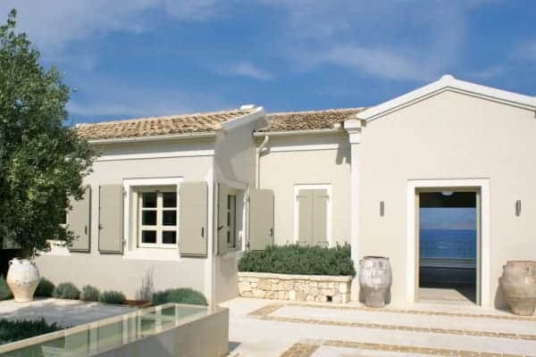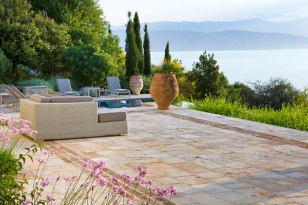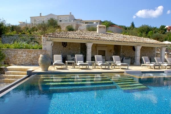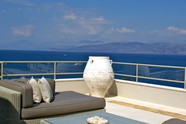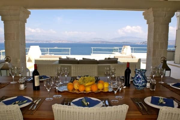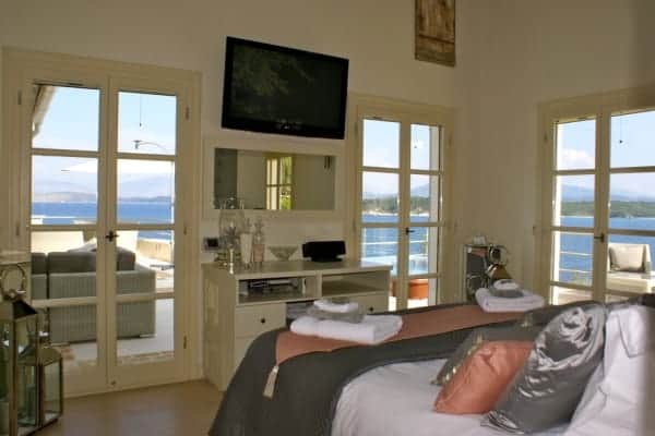 The open plan slips easily from one living space to the next and opens on to the summer kitchen area where a barbecue and outside bar make for delightful alfresco dining. The infinity pool, Jacuzzi and extensive terraces are bordered by swaths of scented plantings that include; thyme, ornamental grasses, Persimmon trees and rambling roses. However, it is the tantalizing expansiveness of the ever present Ionian Sea to which the eyes return as it reaches out endlessly towards the horizon and the verdant national park in the distance.