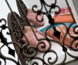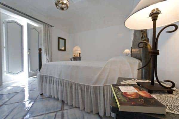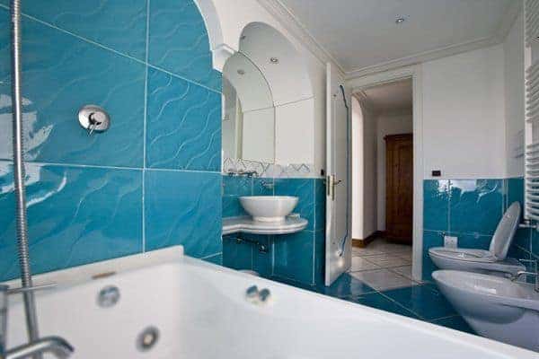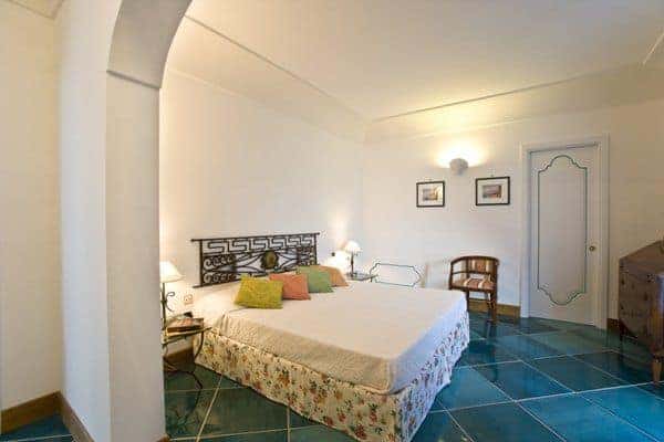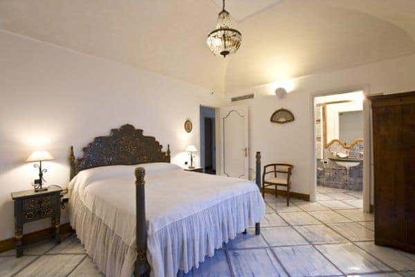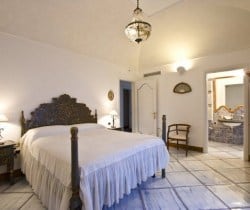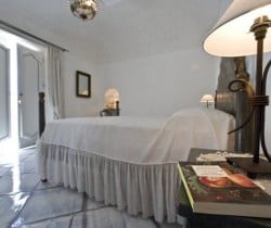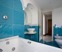 This lovely family home is set over 2 floors and one guest annex, with a total of 5 double bedrooms en suite that sleep up to 10 people.  The bedrooms can be arranged in other configurations if desired (twin/doubles, etc.) and one bedroom suite is in the annex, which has its own entrance.  A second independent annex houses the staff quarters.  All bedrooms have independent air-conditioning, safe deposit boxes and iPod docks.  Bathrooms are modern, appointed with stylish showers and fixtures.  Everybody is guaranteed a beautiful sea view from their bedroom window: the two on the upper level have balconies and those on the lower level open out on to a continuous terrace.  Sliding glass windows open the living and dining areas to a veranda facing the bay and there is great attention to detail in the decoration and furnishing of the rooms: wrought-iron bedheads; vibrantly-coloured and well-appointed furnishings and fabrics harmoniously contrast with the décor’s primarily green and blue colour motif.  Classy and ultra-chic pastel sky-blue local majolica floor tiles adds sparkle to the villa, which presents a wonderful Mediterranean setting for a first-rate, top-notch holiday.