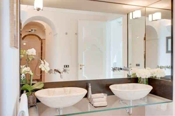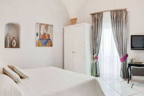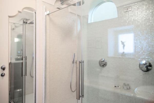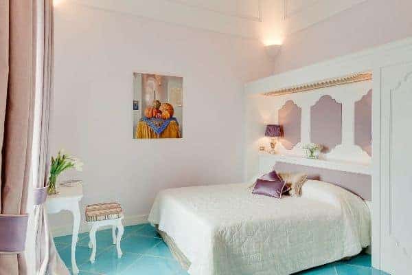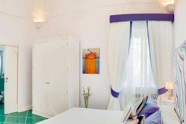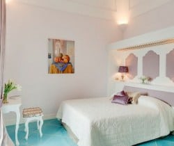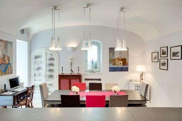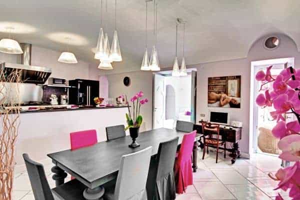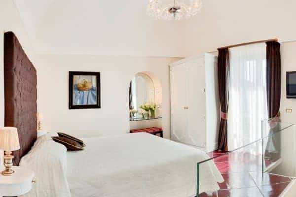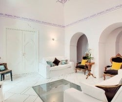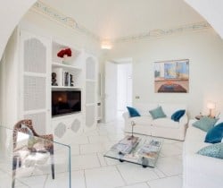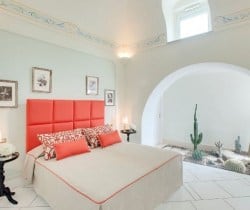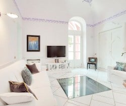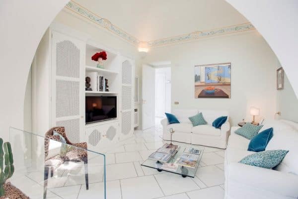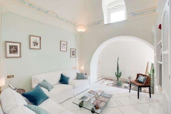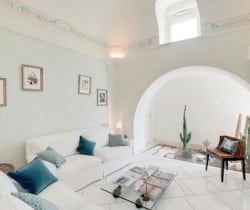 An infinity of little streets and steps line the terraced hillside where bright bougainvillea and scented geraniums lead the way to the sea through a maze of houses clinging on the rocks, majolica covered domes, and devotional shrines. A seductive mix of luxury and charm is the evident yet understated common denominator of one of the most exclusive residences along the Amalfi Coast, where all the modern comforts and the deep blue sea flanked by fragrant lemon groves and lush Mediterranean vegetation, offer total relaxation and utter privacy. Located in the heart of Praiano’s historical centre and only 100 metres away from the scenic route that leads to the beach, this luxury villa is a prestigious eighteenth century building that was once home of the noble Fusco family. While retaining its original architecture and charm, the villa has been brought back to the splendour and magnificence of the past through an extensive and very recent renovation. With an enviable position overlooking the sea, the property enjoys a total area of more than 350 sq. m spread over 3 levels and connected by an elegant white wooden staircase. The common areas are spacious, pleasant and bright, adorned by elements of design, antique prints of the coast and delicate restored frescoes on arches and vaults.
