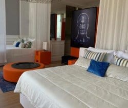 The beautiful 3-level luxury villa offers 5 spatially generous and richly furbished modern bedrooms en suite providing a variety of designs, shapes and themes to delight up to a maximum of 16 guests. The master bedroom arrangement includes 2 king-size beds, walk-in closet and lounge. Another suite boasts a movie projector and the guest bedrooms interconnect and offer either pool or sea view. With the integrated sound system throughout the property offering another sensory backdrop to the awesome sea vistas, you can lose yourself inside the villa and out in the fragrant grounds on one of its tantalising, multi-level al fresco living terraces. With much privacy and seclusion, this luxury property is an idyll for quality rest and relaxation; whether solitary or socialising or in sunshine or shade.
