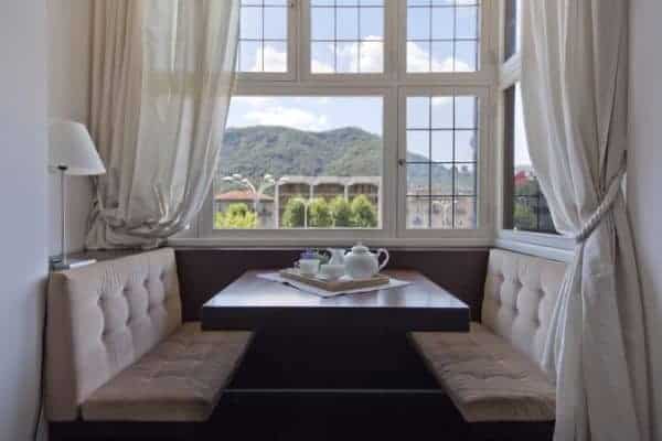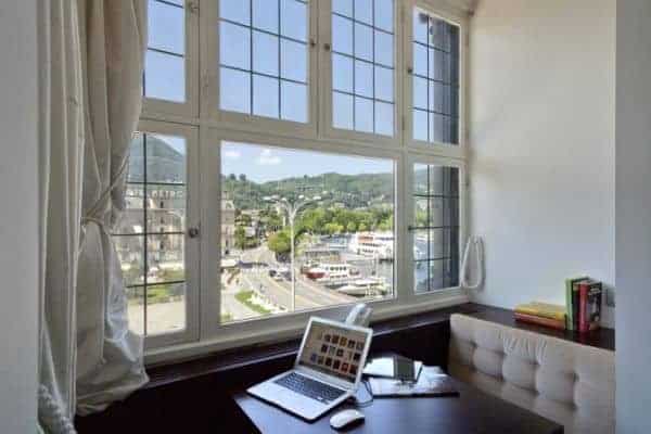 The luxury apartment sleeps 4 in 2 luxury double bedrooms en suite. Above the apartment is a top floor (‘mansarda’). This can be available to provide further options and flexibility; whether for additional 4 guests or for use as a business area. This floor benefits from havingindependent access and is fitted with the most modern technology, including a cinema room that can also be adept for conference calls! The apartment’s main living area also comes equipped with a projector and also two large corner bow windows, arranged with table and a small sofa. You may very well be enticed into spending the entire day relaxing in either spot: from breakfast to evening aperitif or whether nestling down with a good book, work or graciously gazing down at people or out to the scenic lake; all from high above. The sauna will be an attractive retreat following a long business day and during winter evenings and, although there is a neatly equipped and compact kitchen supplied with a breakfast table, guests may be tempted to pop downstairs to sample the wares of many of the area’s best restaurants that are close by.