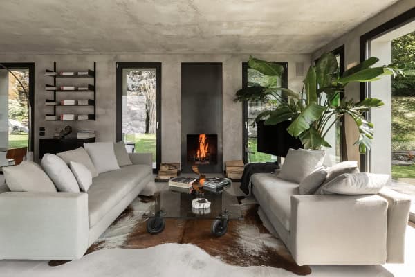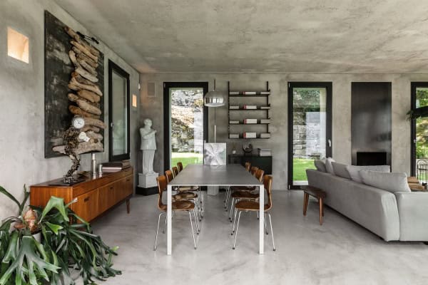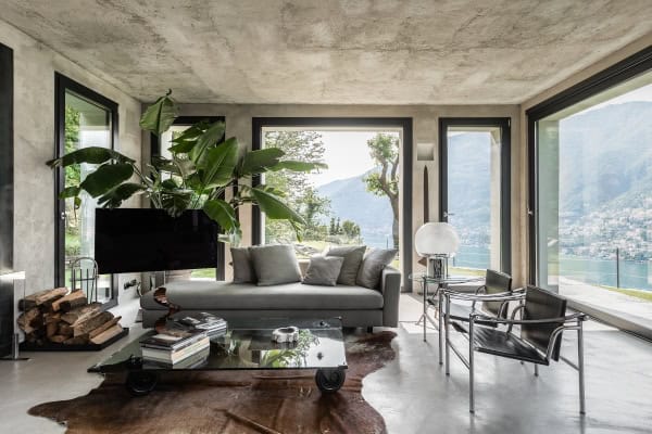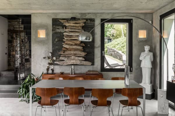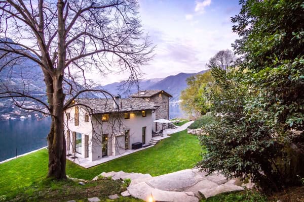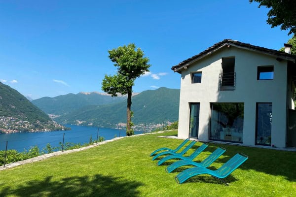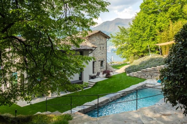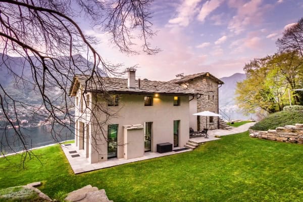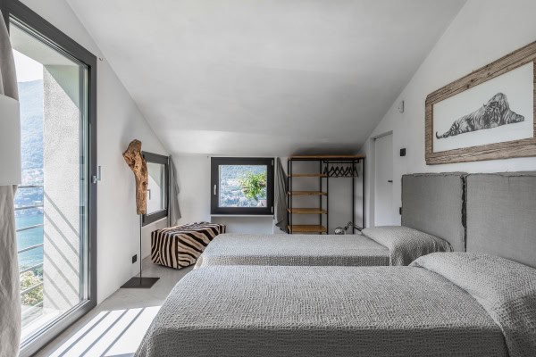 Superlatives are multiple and the norm for a beautiful luxury villa high on a hill overlooking the lakeside village of Torno. This property is highest and the building is the very last of the village; in a preeminent position right at the very edge from which woodland and forest takes over the landscape. The villa is a two-minute drive uphill from the village centre and with the elevation comes unimaginably picturesque and panoramic views over Lake Como and across to the village of Moltrasio on the opposite shore. Immediately behind the garden of the villa, starts the forest, which along with higher up in the mountain is accessible via garden paths. The main walkway leads from the parking area (for 4 cars) up to the main entrance (a 50m stroll) of the building, which is a well-restored and refurbished “rustico”; the oldest part of it dates back to 1700. Added and connected to this is a new section of which the interiors present a very modern style, yet the exterior finish is near seamless not distracting. In fact, the planning of the interior design and a contemporary décor is of the highest quality. The same can be said for designer furnishings that are finely showcased in the light that filters through glazed walls to the outside, which bounces off the resin flooring and warms pristine white walls. The owners have also lovingly incorporated their passion for primitive art and Bali art. An eclectic selection of rare objects d’art from Africa is on proud display throughout the villa, as are original pieces by one of the owners who also is a distinguished artist. There is another admirable feature to this villa. It is a basement level carved into mountain rock. A corridor is the only thing separating ancient hard rock from the sauna and one of the two bedrooms en suite. Glazed walls and imaginatively placed lighting has created a subterranean sanctuary and the owners put the excavated stones to good use: as the foundation for a Balinese garden with a mini-waterfall and shade provided by tropical trees.