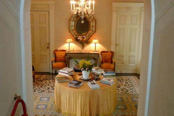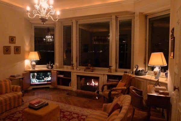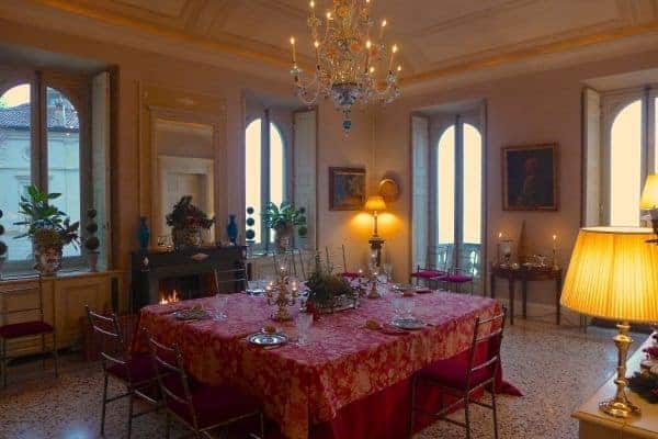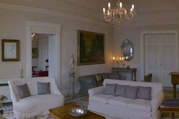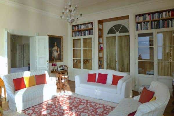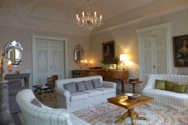 | Ground floor: | Frescoed entrance hall from the courtyard level with lake view; frescoed music room with grand piano and balcony; frescoed living room with fireplace; frescoed dining room with fireplace; kitchen |
