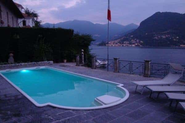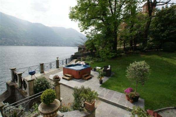 With a surface area of around 2,000 sq. m spread over 3 floors, this luxury villa sleeps 16 people in 8 comfortable and tastefully furnished bedrooms. Stately antique and furniture combined with blue wall tones instil a sense of peace and tranquillity, and the villa’s large windows provide perfect outlooks on to a highly scenic lake and mountain landscape. You will find the living room warm and welcoming – its fireplace and cosy sofas offer much needed therapeutic cosiness on colder evenings – and enjoy the benefit of sunshine streaming through, from early morning into the afternoon. Your admiration can only increase when you go outside on to the spacious, tiled terrace overlooking the lake or retreat to the romantically shaded chill-out area and, even more so, as you dine on delicious meals al fresco whilst gazing out at the picturesque lakeshore villages of Torno and Cernobbio. Children will love playing in the lush garden, probably as much as adults will enjoy it as a sanctuary for some relaxation and repose. Here you will be refreshed by soothing lake breezes, the reassuring crunch of gravelled walkways, the cooling shade of trees, the calming trickle of fountain features, the bloom of flowers and silky touch of lawn and an enviable social hub; a patio Jacuzzi, which holds up to 6 people and a swimming pool majestically perched on the lakeside.