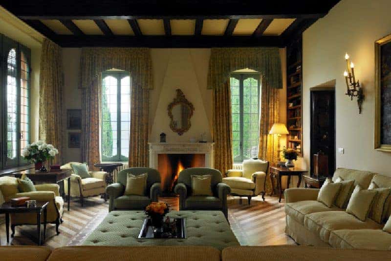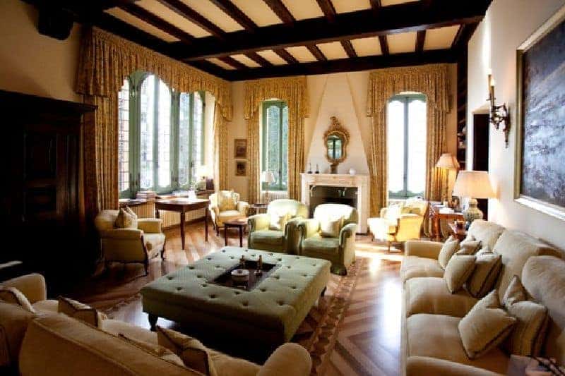 | First floor: | Master suite composed of double bedroom with fireplace, office area, en suite bathroom; double bedroom en suite; 2 double/twin bedrooms en suite |