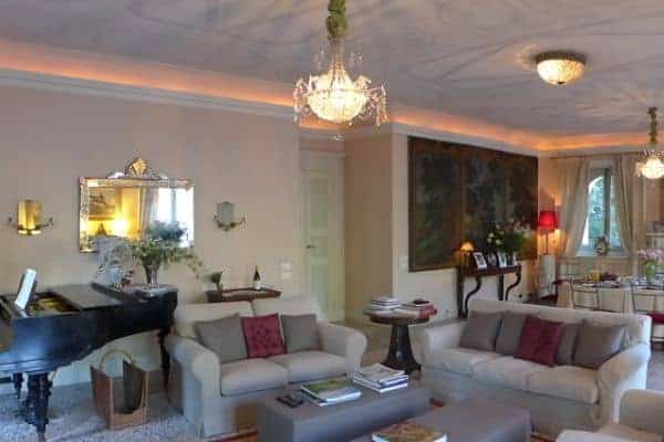 Arranged on four levels this is the smaller of two villas on a vast estate and it can accommodate up to a total of 10 guests in 5 beautifully appointed and generously sized bedrooms; 3 of which are versatile twin/doubles. Be warned, it will take a vigorous stroll uphill to reach the temporary swimming pool, but the effort is well worth it! This elevated position provides the loveliest lake view. The best thing about this villa is its enormous lakeside terrace – somewhat balancing the effort required to reach the pool -from which you can jump into the lake. There are many shady nooks to retreat into to enjoy tranquil seclusion, to become lost in a favourite book or admire the serene beauty of the superb lake views. From dusk there is nothing finer than enjoying an aperitif on the beautiful terrace as the lights of the surrounding villages flicker and twinkle up the hillsides and reflect on the lake. A courtesy boat is available for excursions to some of the other small lake villages close by (Cernobbio, Torno, Moltrasio) and, of course, to Como.