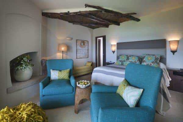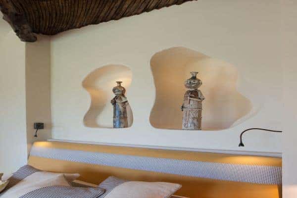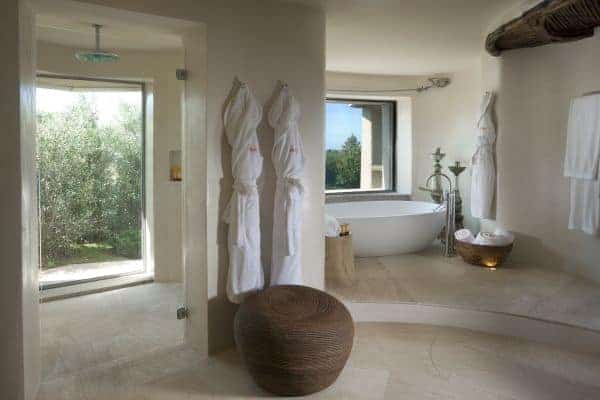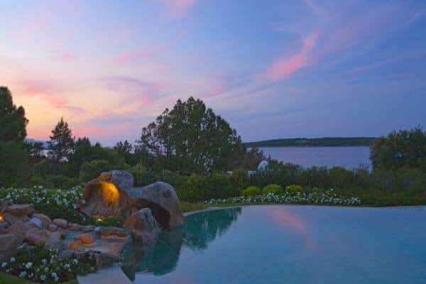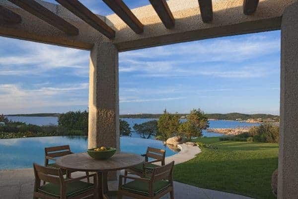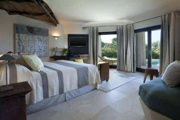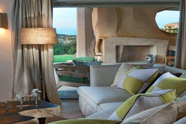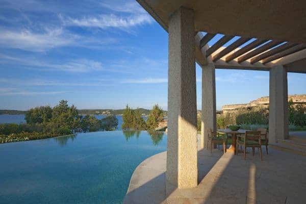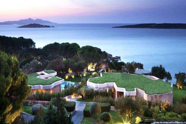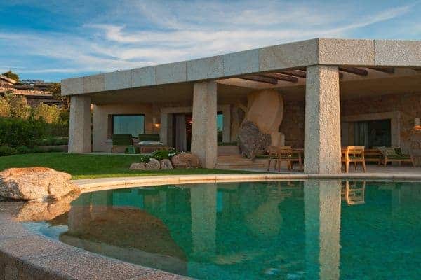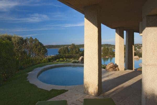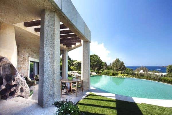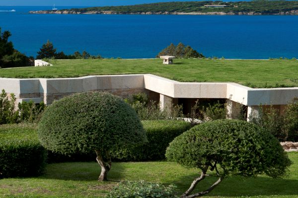 Adding another bow to the reputation of Porto Cervo, the long renowned holiday destination of the rich and famous that was created by the Aga Khan at the beginning of the 1960s, is a luxury villa that overlooks a crystalline bay cove and has also indescribable sea views and privileged privacy. Porto Cervo is the heartbeat of the Costa Smeralda on the island’s north east coast, yet retains an air of exclusivity, just forty minutes’ drive from the international airport. Nestling in the lush green landscape with unique grass-roof lawn – a camouflage that is a characteristic of the area – this is a luxury villa that blends beautifully into the environment and where tradition and innovation meld in elegant harmony. It is a contemporary luxury villa inspired by traditional Sardinian construction and designed for seamless transition between the indoor and outdoor spaces. Invigorating and cool white rooms are in open plan layout and with sliding glazed openings. Carved walls inset with contemporary art pieces and modern, comfortable furniture that enhances the chic, modern ambience created by the décor and the arrangement of rooms that are allowed to stretch outdoors with seamless transition. The masterstroke of the villa is its main, sea-facing terrace that offers superlative coastal vistas. There are dining, lounging and sunbathing areas on the terrace, which is fronted by an adjacent, commodious swimming pool (heated) and an enormous, rotund inset Jacuzzi.