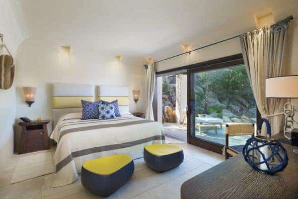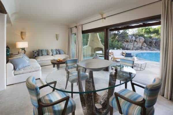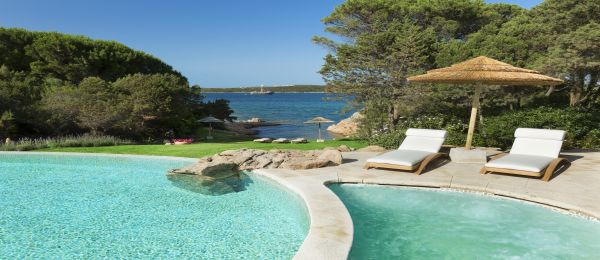 Located on the Costa Smeralda of Sardinia a 150 sq. m luxury villa nestles hidden away within the gardens of the most exclusive premier deluxe hotel in Porto Cervo; the holiday retreat of the super-rich and famous and a resort renown for an array of world-class shopping and restaurants and a glamorous nightlife. This lovely property nestles under shady pines and sits 300m from the shore of the estate’s private beach and presents a luxurious sprawl of cool, open spaces and reclusive corners perfect for hot summer afternoon siesta. Its contemporary Mediterranean interior design is a lovely use of local materials coordinated with pastels and beige to create a symbiotic connection of continuity to outside; the outlook of a shimmering emerald sea. The expansive terrace and garden includes the extraordinary bonus of two heated swimming pools of varying size, plus an outdoor Jacuzzi.