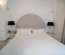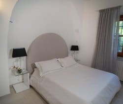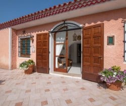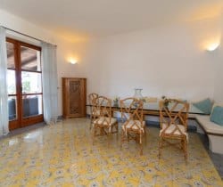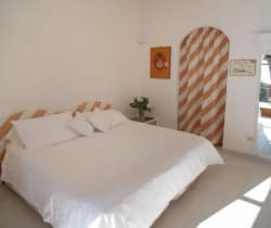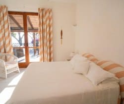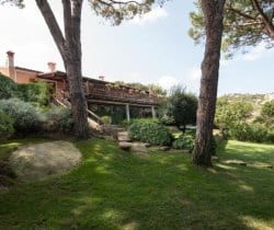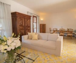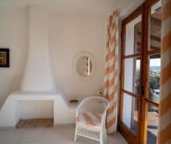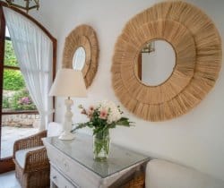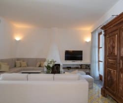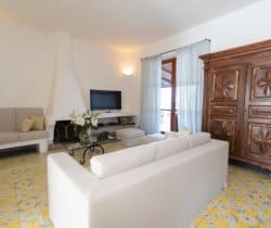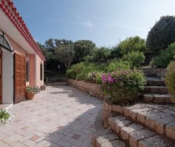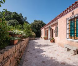 The main house is on one floor and a lower level that is accessible only via the entrance on the lower veranda. There are 5 bedrooms – including a children’s room with a double bed and a pull out bed for an adult – that sleep up to 10. The lower level houses a large guest bedroom en suite. The bedrooms and bathrooms are understated, yet furnished for comfort and designed for capturing gentle sea breeze: high ceilings, white-tile floors and generous French windows, graced by ever-billowing curtains, while the four on the main floor open to the terrace. Elsewhere, white and yellow patterned floor tiling in the living areas adds Sardinian sparkle and numerous large, pristine white-cushioned sofas add élan, antique pieces and more contemporary furnishings add contrast. The entrance hall is charm itself and, with 2 two-seater sofas, provides a cosy nook for reading, doing a crossword puzzle or planning your next island excursion! However, it is likely most time at the villa will be spent outside. There, on the more recently refurbished wood-decked terrace, the very appealing al fresco lounge (with attractive cushioned wicker sofas) and dining area is all the more enjoyable for the view over the enchanting garden to the beach beyond.  Of course, the barbecue area is also a must in a villa such as this.