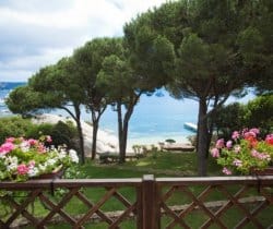 Off a small road in Porto Rafael, there is a gated entrance to another world: one luxurious and immensely beautiful private villa. It is a 1953 built property lovingly maintained by its owner and is not overlooked, so remains utterly private. The measured elegance of the villa’s interior continues outside, on a long and wide terrace with a captivatingly lush shade provided by a wooden pergola. The view from here is impressive and, apart from the rare Mediterranean pine trees, unobstructed and far-reaching views of the Mediterranean Sea. At anytime, day or night, there is a fantastic ‘sense’ of sky and air, sea and tranquillity. The beautifully manicured and mature garden has step paths, shady spots under pine or palm trees and slopes down toward the ‘pièce de résistance’ of this property: a sandy beach, more beautiful than photos capture! Edged by rocks and with generous shelf of white sand sloping gently into the sea, the beach is completely discreet and secluded even from passing boats. This is a unique find and a rare gem, especially as there are very few beaches of this kind anywhere in Italy that is for exclusive use and enjoyment.  In the vivid, warm crystalline water there’s also a mooring pier large enough for a yacht (maximum length of 16 metres) or two!  The beach is child friendly, but supervision of small children and infants is recommended.