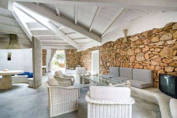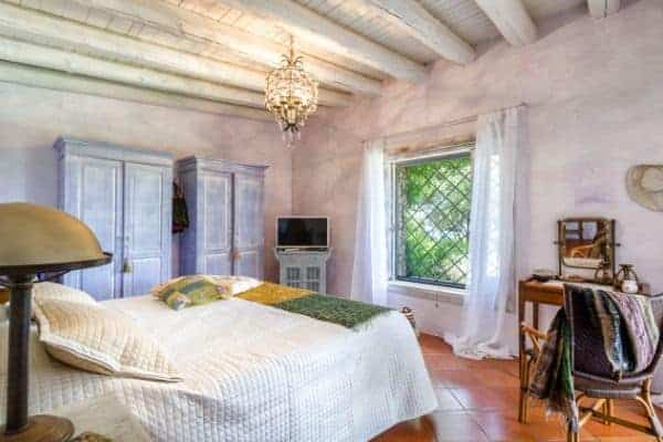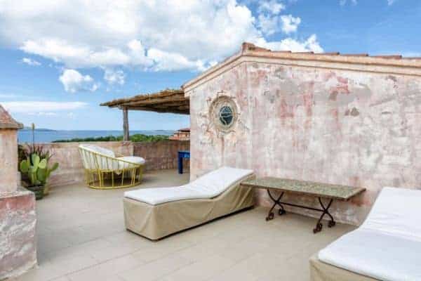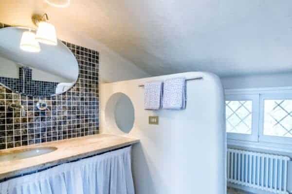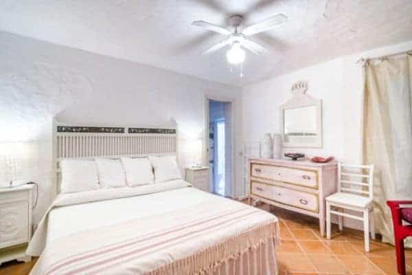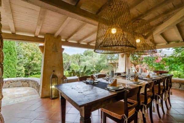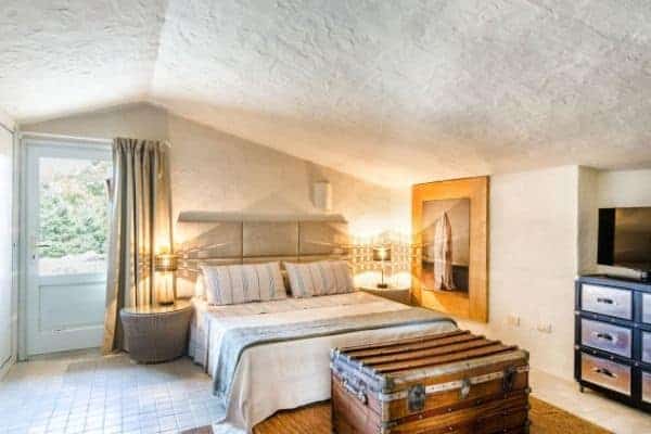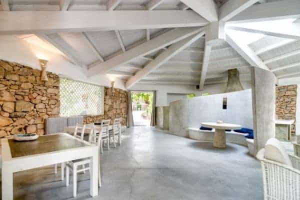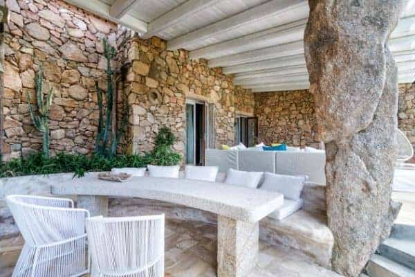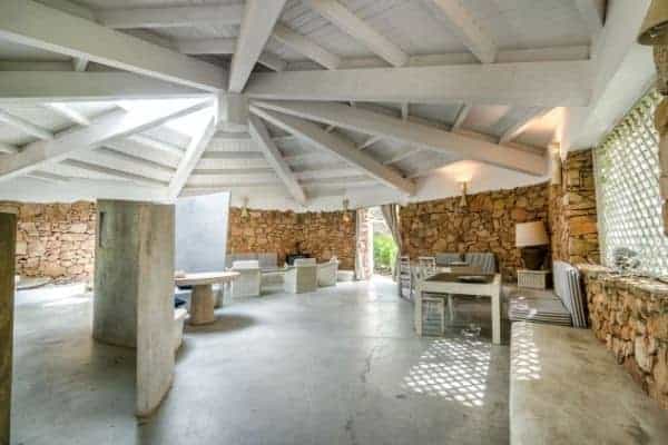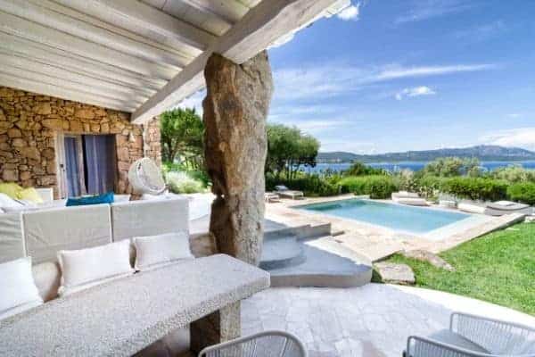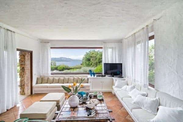 Thoughts about a perfect Mediterranean holiday by many people will be of restful relaxation at a very private luxury villa on a small sandy cove, with a view of an endless emerald sea under a sunlit azure sky. This is what you shall enjoy at this luxury villa, which is but a short walk from the vibrant centre of the glittering social life of ultra-exclusive Porto Rotondo: a beautiful seaside village on the Costa Smeralda. The village takes its name from a natural inlet, which has formed a near-perfect circle of luxuriant vegetation and sea. The villa fully embraces the natural charms of its surroundings and its traditional construction is freshened by sea air and the property’s eclectic configuration. Secure and fitted with tall modern conveniences – including air conditioning and satellite TV – the villa is a private sanctuary entered via a main veranda, up a flight of 11 steps, with the front window door opening opens directly to a contiguous arrangement of living space, which includes a bright lounge with wide windows, white walls and bespoke cushioned sofas along the walls. The dining area (3 steps up) seats 6 and is adjacent to a well-appointed kitchen that opens to a covered, outside and larger dining terrace (seats 8) by the swimming pool, for al fresco meals with sea view at any time of the day. Friends can stay over independently in the guesthouse at the far left side of the property. Accessed from the main veranda, the annex is an apartment-style arrangement with 1 double bedroom en suite, a living room and another fully fitted kitchen with dining area and garden entrance.