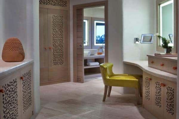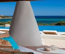 The large, luxury villa has 2 levels and will accommodate up to 10 persons in its 5 double bedrooms en suite. The grand master suite is the only bedroom on the first floor and all bathrooms – trimmed with local Orosei marble and arranged with adjoining dressing room – are designed as a natural extension of impeccable private spaces extending out on to equally private terraces. The villa’s exquisite main communal terrace is perfect for cherished Mediterranean al fresco relaxation. Its delightful overlook over the lovely pool and out to a flawless seascape will certainly be one of the things of which you will not tire: whether it is day or night, at breakfast time or at cocktail hour and, whenever you fancy, you can enjoy a dip in the heated pool and join the vivid aquamarine sea that stretches to the horizon.