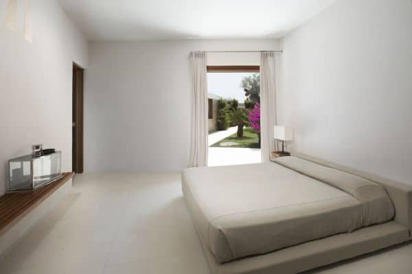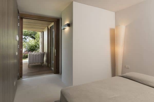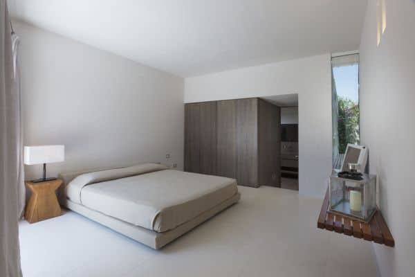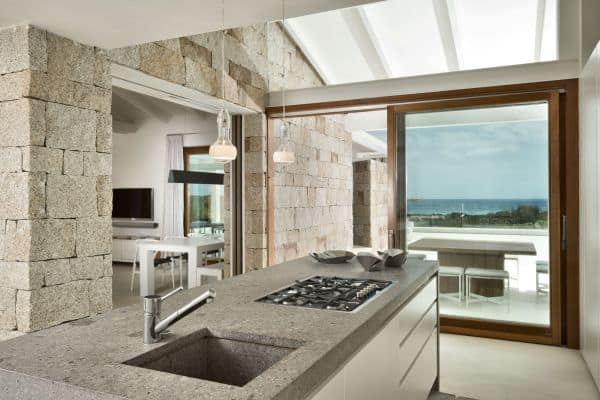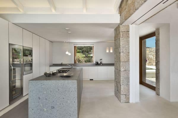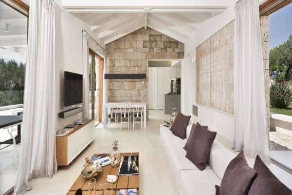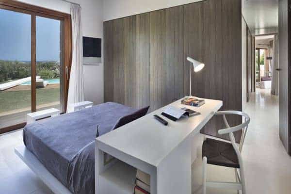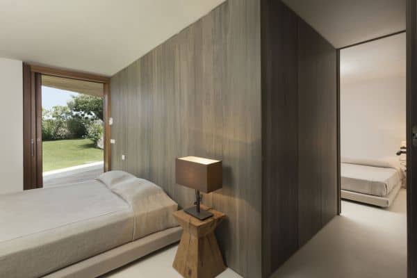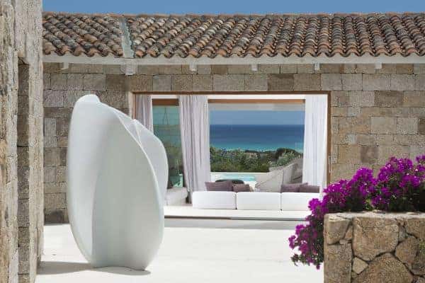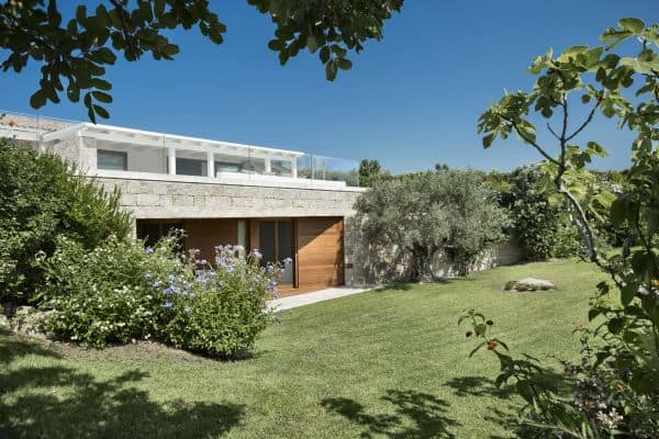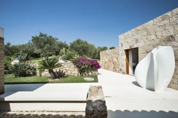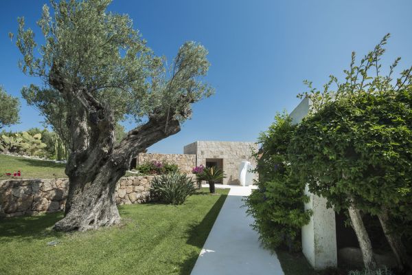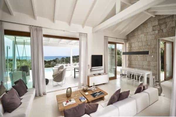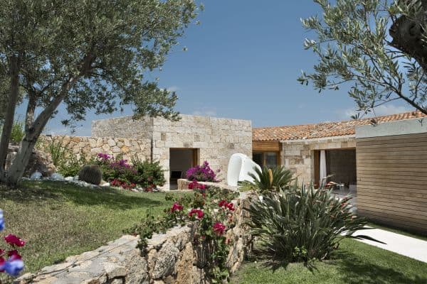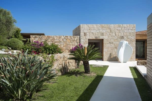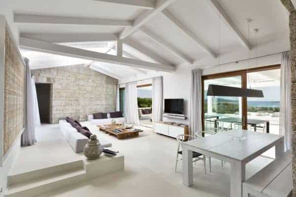 Foremost of Sardinia’s achingly beautiful beaches is Lu Impostu – bordered by juniper trees and crystalline aquamarine water and dusted with glittering fine sand – where 400 metres away is an overlooking and luxurious villa. This new two-storey family residence is with a private and gated compound noted for precise management and maintenance this luxury family residence. It is one of a few privileged properties blessed by this super location and offering maximum seclusion and privacy. In the villa’s 3,000 sq. m garden of high Mediterranean shrubs, bougainvillea and cacti has two distinct levels and from the upper section even the sublime seascape is possible to view through the extensively glazed main indoor living, which on the upper level of this property. Also at this level are the delightful sea-view terrace and a generous swimming pool area above the lower garden and lawn. Inside a tasteful arrangement of Santa Fiora stone and Iroko wood flooring cleverly inspires modern Mediterranean minimalism, while the illuminating and breezy indoor living area under vaulted, white beam ceiling is essentially a continuation of the fabulous terrace from which it can be separated by sliding glazing.