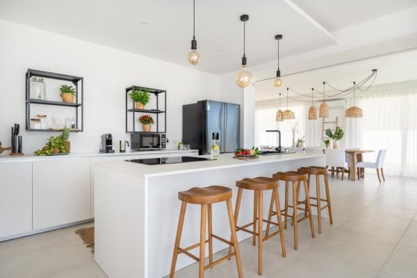 Both roomy and airy, the property can comfortably host up to 8 people (4 additional kids can be accommodated in sofa beds) over 4 en suite bedrooms, and boasts an infinity pool that looks out over the Mediterranean Sea. There are many indoor and outdoor social spaces, including an al fresco dining area, outdoor chill out area, veranda & barbecue area, and various indoor lounge spaces.