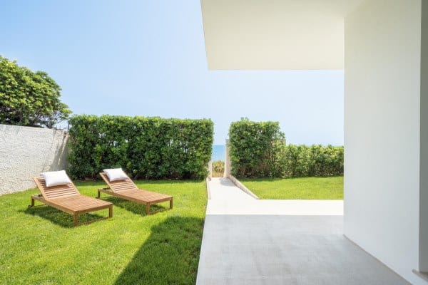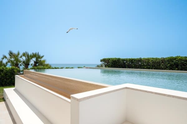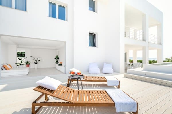 Pristine white beach villa with direct access to the turquoise Ionian Sea