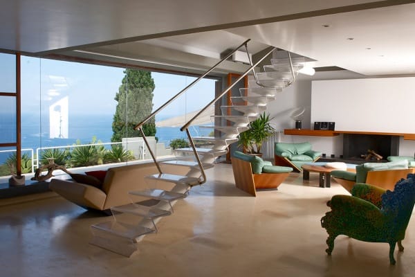 | First floor: | Living area with panoramic glass tower and sea views; Master double bedroom en suite with private terrace |