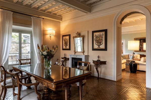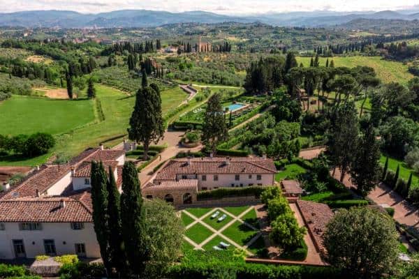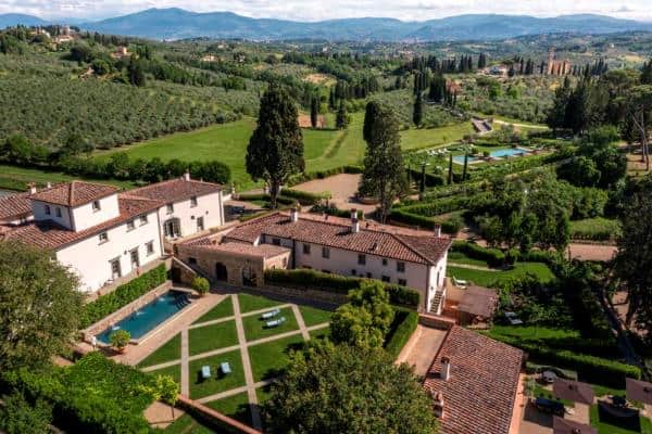 Set on 30 hectares in the hills on the immediate outskirts of Florence is the former summer residence of the Ghirlandaio family, where the beautiful frescoes of Ridolfo del Ghirlandaio ordain the family chapel within this vast and secluded hilltop estate, parts of which date back to the fourteenth century. In effect a hamlet of five separate and independent villas, this unique, restored property is finished to the highest of standards to offer an incomparable holiday immerse in a sense of history, privilege, privacy and luxurious comfort. Equally impressive is the sublime view of Florence and its famed domes. It is a sight that would have been shared and enjoyed also by other famous visitors and guests, including other legendary artists such as Botticelli and Raffaello. Now utterly transformed into a luxurious private hideaway, a mere fifteen minute drive from the historic centre of Florence, the approach alone off the main A1 motorway wends its way along the hillside and also winds up one’s level of expectation that is fully justified on arrival. Furniture and antique pieces from across Tuscany compliment the fine restoration of appealing living spaces, including the fabulous conversion from once part of an ancient dovecote tower into the main villa. Oak parquet floors, vaulted, coffered ceilings, marble fireplaces, vaulted Restoration ceilings and Impruneta terracotta tiles, are in keeping with the property’s charismatic and architectural heritage. Added to the mix is a host of modern luxuries: air conditioning; a wonderful modern stone/brick vaulted spa below the main villa featuring a sauna, jacuzzi, steam and massage room; sleek marble countertop kitchens; stone-built barbecue and pizza oven terrace; en suite bathrooms covered in precious marble. The grounds are immense and immersed in silence and feature an Italian garden, thousands of olive trees, oak woods and cypress trees within the surroundings. In order to fully appreciate the atmosphere the outdoor terraces are also furnished to the highest standards and the unique appeal of this property is enhanced by its two swimming pools; the larger at the front of the property can be heated on request and enjoys a glorious view of Florence and the “smaller” pool located in the Renaissance Garden provides a waterfall cascade.