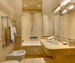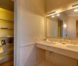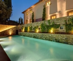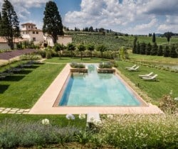 Set on 30 hectares in the hills on the immediate outskirts of Florence is the former summer residence of the Ghirlandaio family, where the beautiful frescoes of Ridolfo del Ghirlandaio ordain the family chapel within this vast and secluded hilltop estate, parts of which date back to the fourteenth century. In effect a hamlet of five separate and independent villas, this unique, restored property is finished to the highest of standards to offer an incomparable holiday immerse in a sense of history, privilege, privacy and luxurious comfort. Equally impressive is the sublime view of Florence and its famed domes. It is a sight that would have been shared and enjoyed also by other famous visitors and guests, including other legendary artists such as Botticelli and Raffaello. Now utterly transformed into a luxurious private hideaway, a mere fifteen minute drive from the historic centre of Florence, the approach alone off the main A1 motorway wends its way along the hillside and also winds up one’s level of expectation that is fully justified on arrival. Furniture and antique pieces from across Tuscany compliment the fine restoration of appealing living spaces, including the fabulous conversion from once part of an ancient dovecote tower into the main villa. Oak parquet floors, vaulted, coffered ceilings, marble fireplaces, vaulted Restoration ceilings and Impruneta terracotta tiles, are in keeping with the property’s charismatic and architectural heritage. Added to the mix is a host of modern luxuries: air conditioning; a wonderful modern stone/brick vaulted spa below the main villa featuring a sauna, jacuzzi, steam and massage room; sleek marble countertop kitchens; stone-built barbecue and pizza oven terrace; en suite bathrooms covered in precious marble. The grounds are immense and immersed in silence and feature an Italian garden, thousands of olive trees, oak woods and cypress trees within the surroundings. In order to fully appreciate the atmosphere the outdoor terraces are also furnished to the highest standards and the unique appeal of this property is enhanced by its two swimming pools; the larger at the front of the property can be heated on request and enjoys a glorious view of Florence and the “smaller” pool located in the Renaissance Garden provides a waterfall cascade.