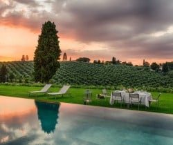 The luxury estate comprises five beautifully restored buildings, each with independent and direct access out onto an outdoor terrace or into a courtyard, has a total of 20 spacious bedrooms en suite for up to 37 guests to enjoy lavish private comfort. All bedroom suites are of comparable quality to underscore the pervading sense of privacy at this property, made all the more exclusive within high perimeter walls. Living arrangements offer scope for versatility, which our concierge will be readily able to adapt to your wishes and needs. The service here naturally measures up and the scale of the grounds means there are a host of places in which to gather ‘en famille’ and to enjoy the company of others, with also a good many spots within the grounds where one can indulge in more private moments of relaxation in the lap of luxurious comfort. The charm of the view, the surroundings and facilities provide a super opportunity for a first-class stay and experience in Tuscany. Other historic centres such as Siena and charming hilltop towns such as San Gimignano, San Casciano and Monteriggioni, as well as the Chianti region, are within easy reach for delightful day excursions.