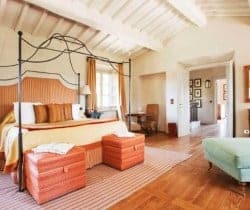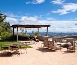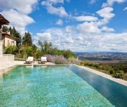 Set over two levels, this luxury villa comfortably sleeps 6 people in 3 bedrooms en suite; each generously spacious, with bathrooms containing separate walk-in showers and water closets.  The bright, airy spacious living areas and chic bedrooms have white wood ceiling beams and original detailing retained to create a classic ambience of grand Tuscan country life.  The outdoor area around the villa is disproportionate in size to the interiors and, as such, is designed as an extension of indoors.  Subsequently there is a magnificent 180° terrace arranged to offer fabulous views and which, has a pergola-covered chill-out/dining area.  Below this the fabulously sited swimming pool and adjacent lawn continue the exterior’s celebration of the open air.  You, your family and friends can relax and celebrate too in this picturesque setting with stunning outlook.