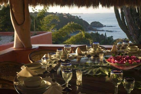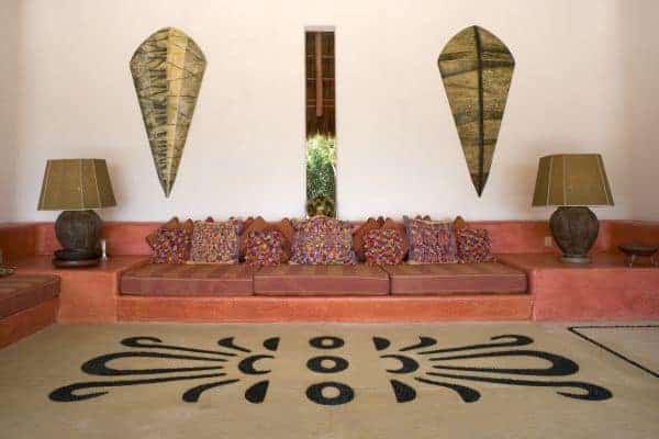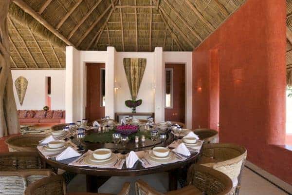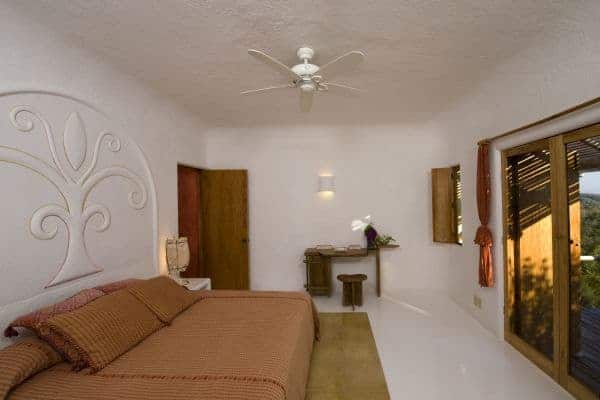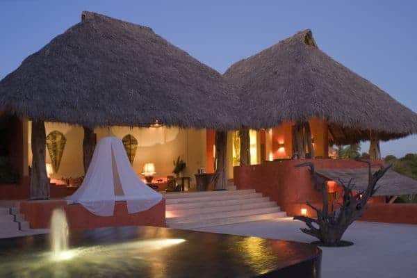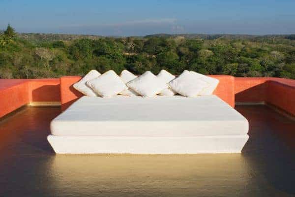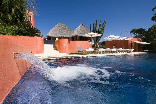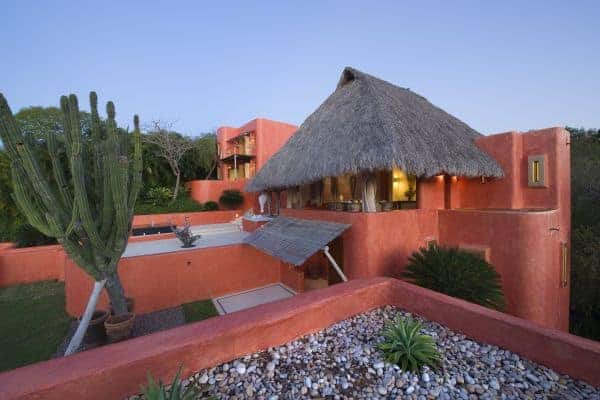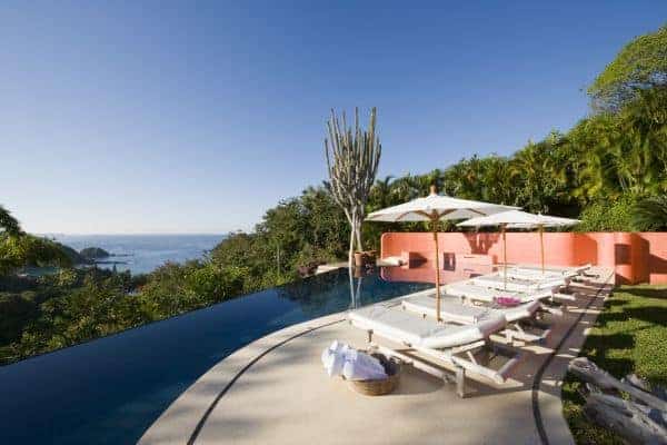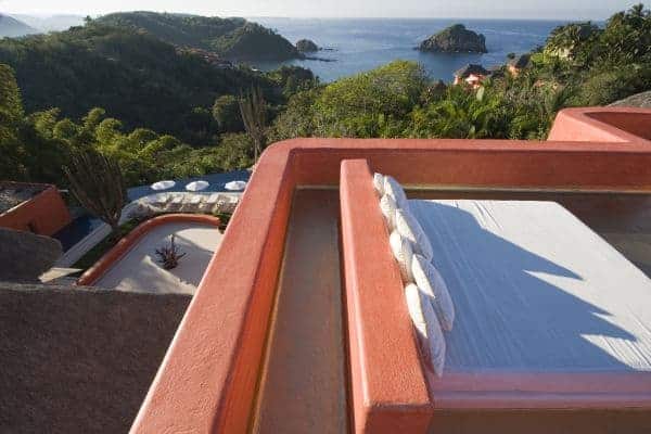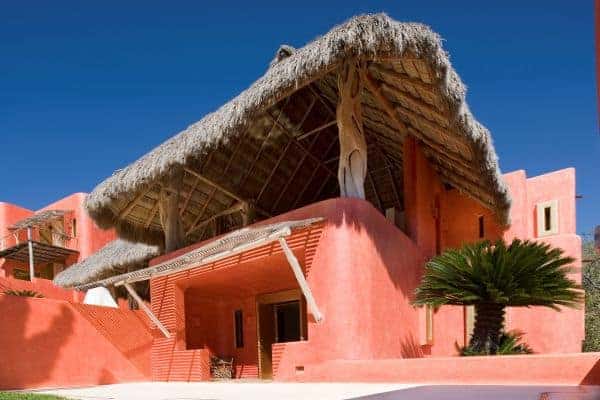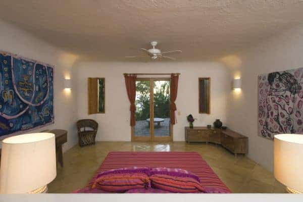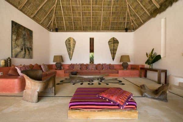 A luxurious villa in Costa Careyes, a special destination popular for inconspicuous relaxation of the unpretentiously rich and famous. This tropical paradise of verdant cliffs and never-ending stretches of untouched beaches is dubbed the “Pacific Playground” and lies north of Acapulco on the Pacific coast of Mexico. It is here, between Manzanillo and Puerto Vallarta, that we find this beautiful villa, which is within a private and exclusive compound developed by an Italian gentleman in the 1960s. Conforming to the ethos of “music of sky, earth, and sea”, his friends have been drawn here like magnets and built their own fine villas in an enclave that now contains 60 villas: each one is gated, secluded and also unobstructed by any other. The net result is that everybody can enjoy elevated and sweeping panoramic views of the coastline and pristine, flat turquoise sea. Like most of the other villas, this particular villa has a design concept of bedroom annexes built for privacy, with open-plan living and dining for socializing. The roof is thatched with palapa (palm leaves) to blend into the lush tropical surroundings and the blindingly bold exterior pays homage to vibrant Mexican colours and flair. The tasteful interior design promotes breezy living spaces, which are finished and furnished with elegant finesse. There is a pervading laid-back and bohemian vibe to the ambience, which summons total and shoeless relaxation. Indoor ceiling fans emphasize the tropical setting, which is fully on display in the lush and exquisitely terraced grounds. An uncommonly long swimming pool that snakes its way around its own terrace, as well as a roof terrace where there is an enormous daybed from which you may enjoy the sunshine and startling Pacific sunsets or count the countless stars on a starry night.