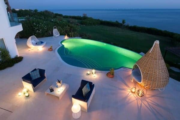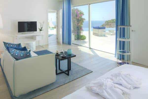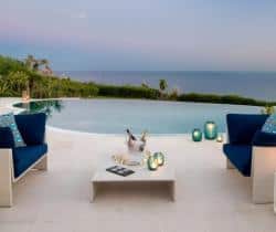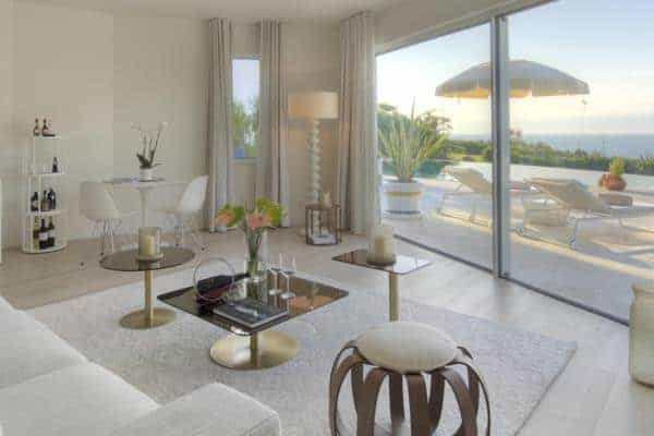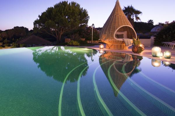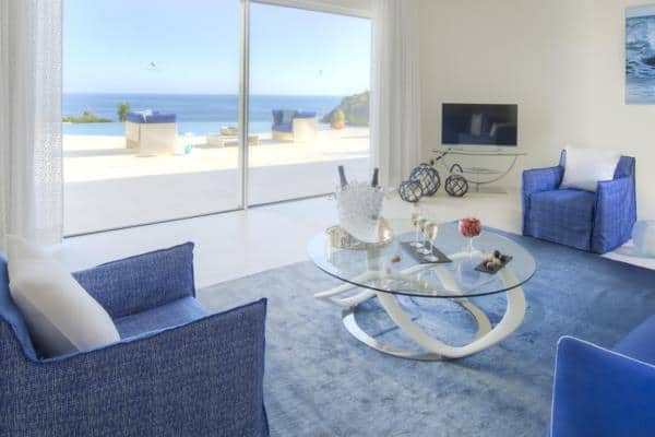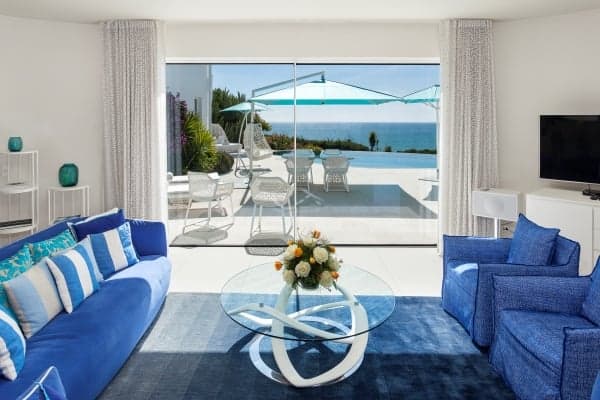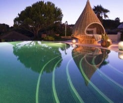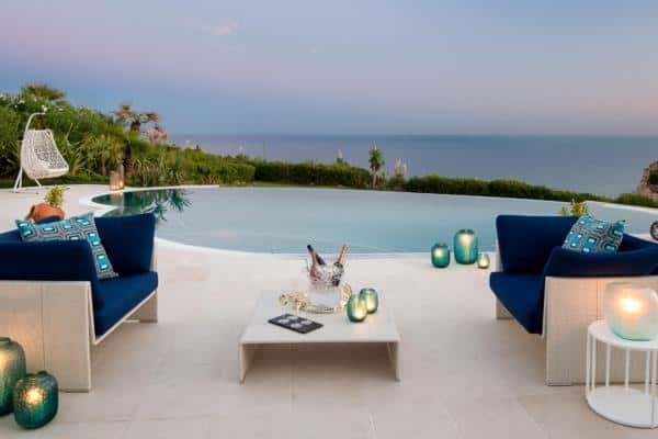 A modern luxury whitewashed villa with North African and Mediterranean accents, such as minarets and terracotta roof tiles, is nestled atop one of the Algarve’s sandstone cliffs and is blessed with a glorious uninterrupted west-facing view sweeping over an unspoiled beach and out to the Atlantic Ocean. To the west of Albufeira and forty-five kilometres from Faro airport, the closest town Porches (three kilometres), is renown as home to the most beautiful Algarve pottery and this luxury rental is a unique one of a precious handful of private luxury villas available at one of Europe’s most prestigious and Michelin-starred resorts. Literally on the doorstep (fifty metres) is the beach – picturesque and unspoiled Praia dos Tremoços – flanked between the crystalline sea and the cliff rock face and rarely crowded. The villa shrouded by indigenous trees and tall palms to ensure complete privacy is formed of several interconnecting architectural blocks of varying volumes and levels: one with an upper floor and two with a roof terrace, accessible from the villa’s main pool via an outdoor staircase. Furthermore the villa is designed with full-length and sliding glazed access to the outside from all the interior living areas, kitchen and bedrooms, whilst air-conditioning and underfloor heating throughout adds to this rental’s allure as an all year-round destination. The décor has a fresh and nautical-inspired colour palette based on brilliant white, pastel or aquamarine blues and silver giving an airy, contemporary ambience accessorised with original artworks by a contemporary artist of renown. Furnishings include an eye-catching range of intricately woven or wicker sunbeds, cushioned sofas, hangings swing chairs and conical-topped seats. These, provided on the terrace, are another fine aspect of this villa’s appeal. The sea-facing, aquamarine and near circular, cliff-edge infinity swimming-pool is flanked entirely by a sun terrace arranged with a dining alcove between the pleasingly furnished chill out and sitting spots. The pool features hydro jets and is child-friendly, with a stepped shallow end as well as a swim current for all ages and abilities.