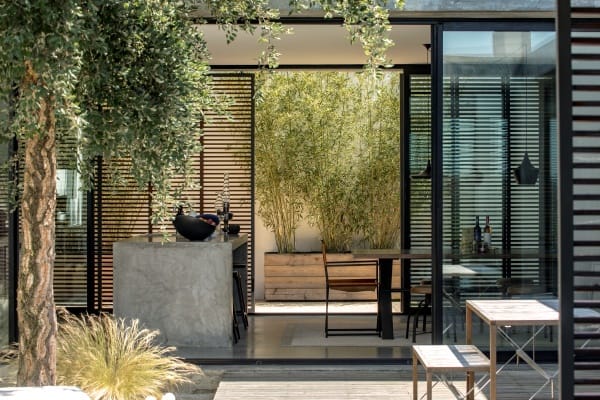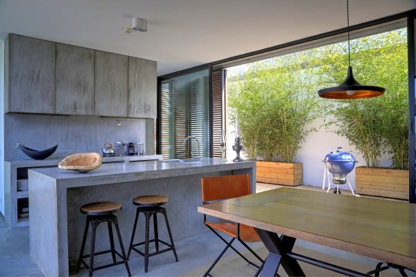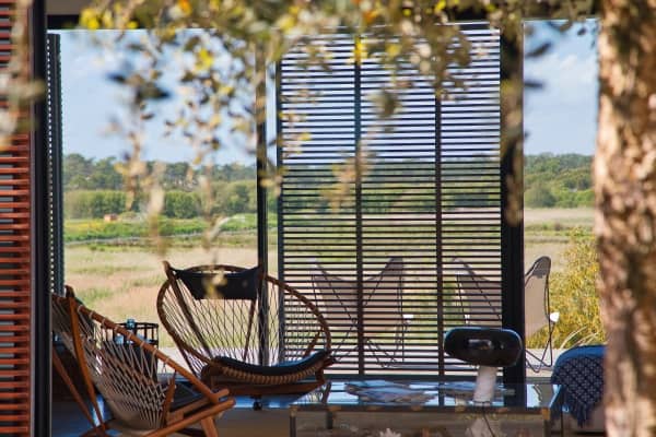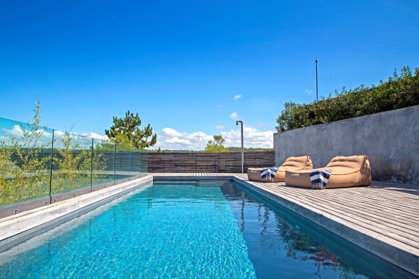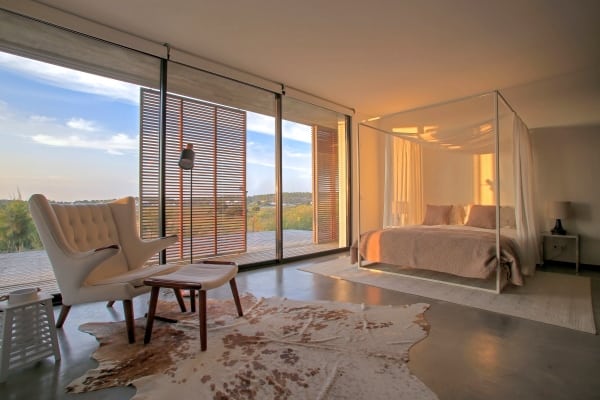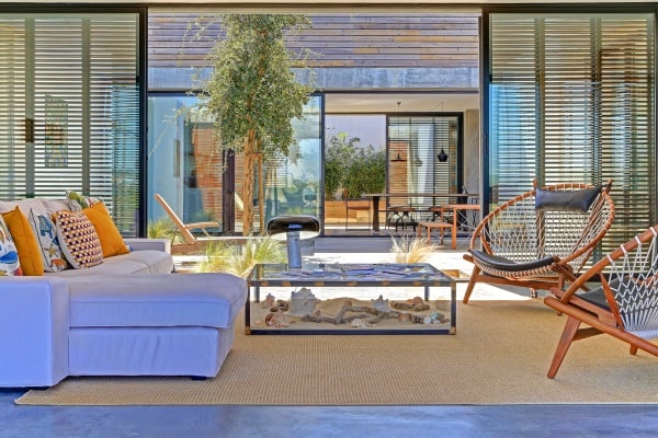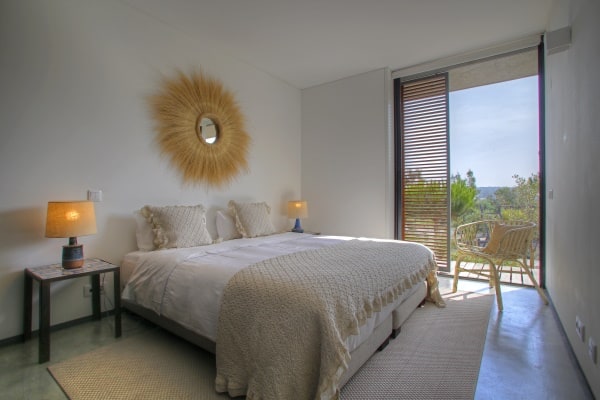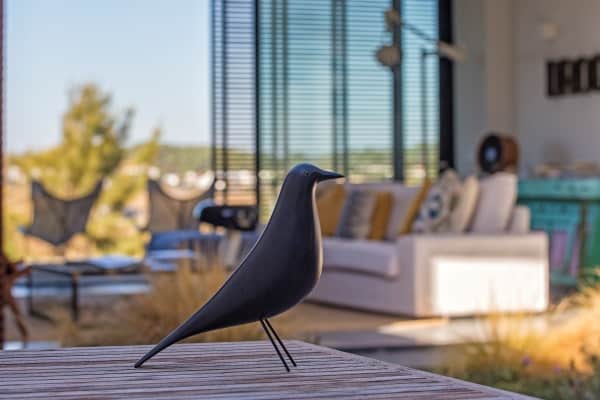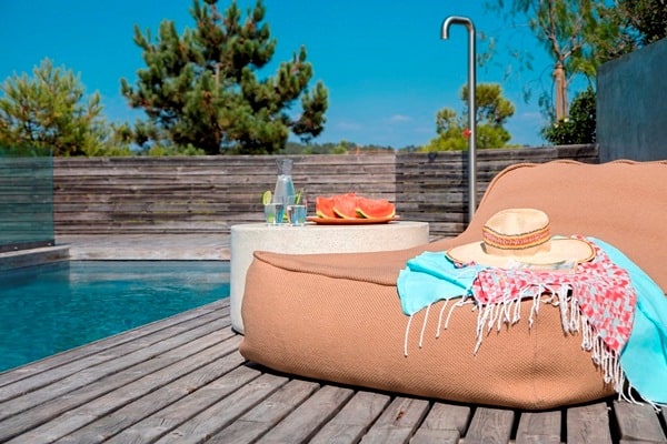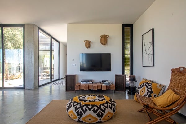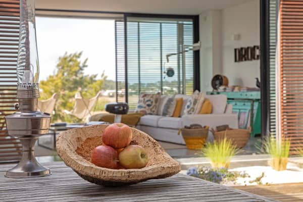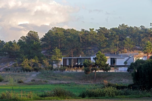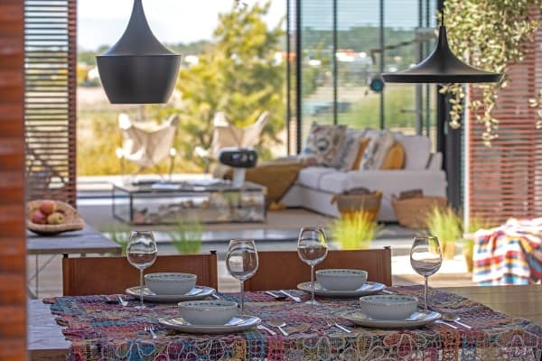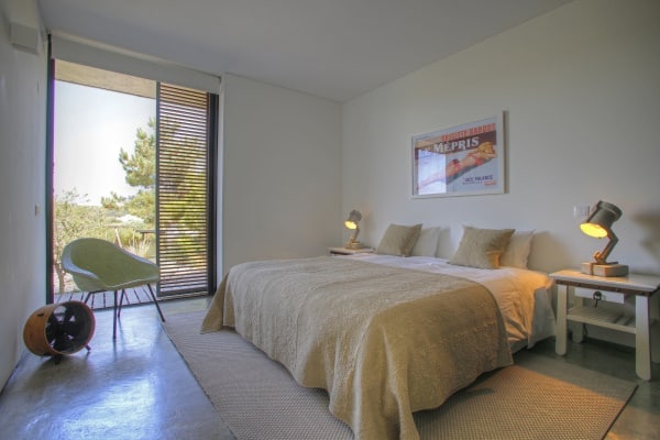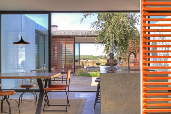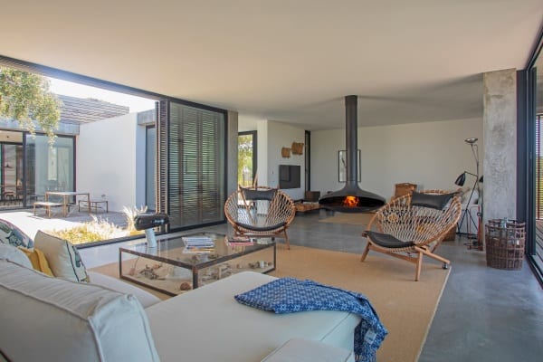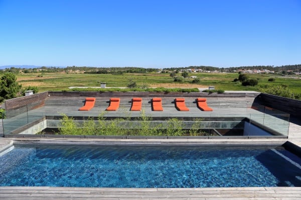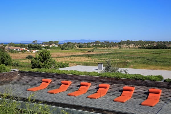 The luxury villa with a sleek, modern design overlooks the sand dunes of Praia do Pego, one of the finest beaches in Portugal and close to the relaxed vibe of Comporta; a “low-key celebrity haunt” away from the more crowded and popular Algarve, yet only one hour south of the capital Lisbon. The silky sand of Prego beach is a short walking distance along a private path suitable for young and old legs alike. The villa is in an area is on the southern end of an estuary, between thick forests and the Atlantic Ocean, which is part of the Tróia peninsula in the north of Alentejo region; labelled the “European Hamptons” because of its continuous stretch of sand over more than 20 kilometres. The villa’s wild and landscaped garden merges effortlessly with the beauty of the surrounding and protected natural environment. The modern building is also the loving creation of a noted local architect, who has not only designed the villa to be extremely bright and airy, but has also blended an eye-catching combination of concrete, glass and crisp pinewood. There are immense high ceilinged and full-sized glazing and sliding doors and panels with spacious modular yet open plan areas laid with heated micro-cement floors. Furnishings are not excessive, but tastefully styled to provide simple, modern design and comfort. Among the big ‘wow!’ features is the impressive 30 sq. m aqua-bright onyx swimming pool which is located on the lower level of the villa’s expansive rooftop terrace. The more elevated upper half is lined with deluxe sun lounger beds, sheltered by plants to maintain seclusion and privacy. A delightful interior patio also decked with pinewood is another captivating and tranquil spot, this one shaded under a cork tree. Elsewhere are sunburst tiles and modern-classic artworks, some specially commissioned from contemporary Portuguese artists, whilst the suspended gyro-focus fireplace and heated floors throughout give this villa considerable off-season appeal.