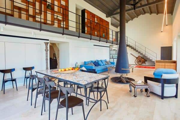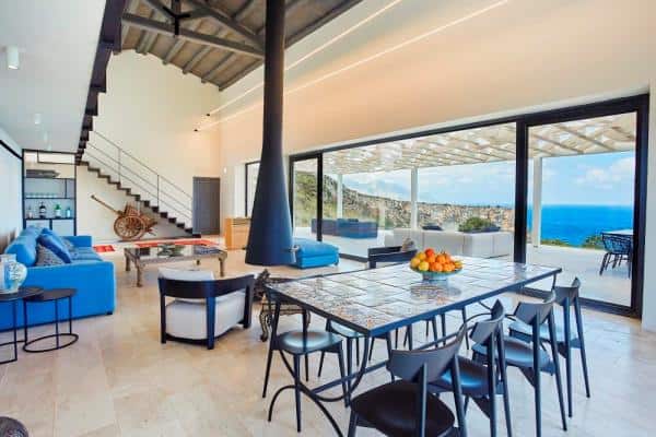 Those who love the water will delight in the circular outdoor infinity pool, which merges poetically with the sea and the horizon. Indoor and outdoor dining tables offer seating for at least 10 people, and for swimming in the Mediterranean, guests can enjoy a beautiful pathway that descends spectacularly down from the property to the public beach.