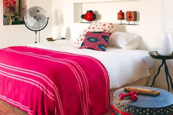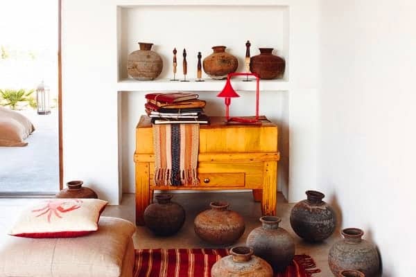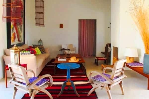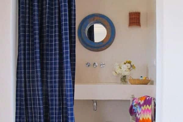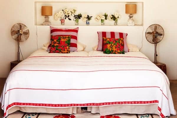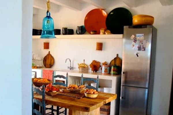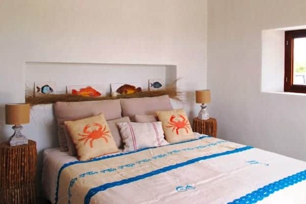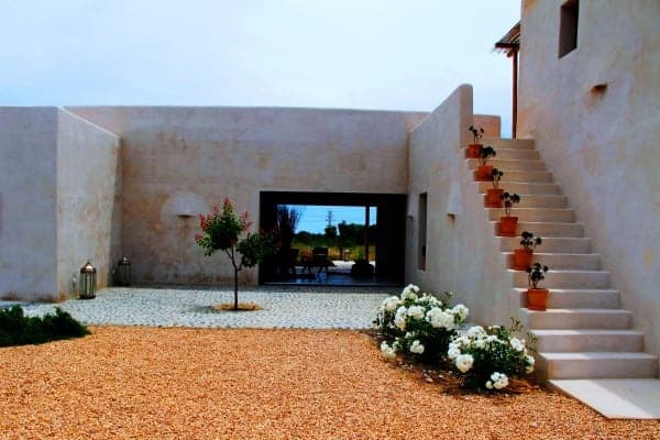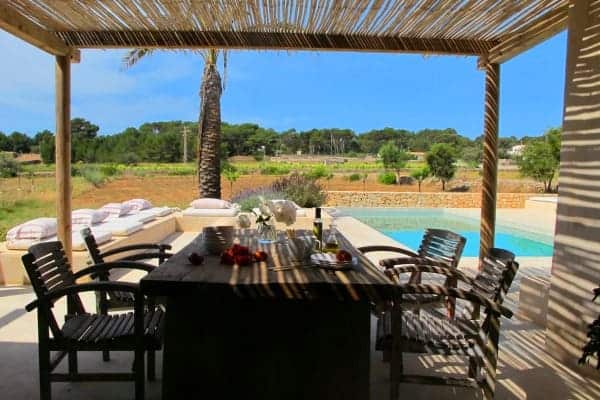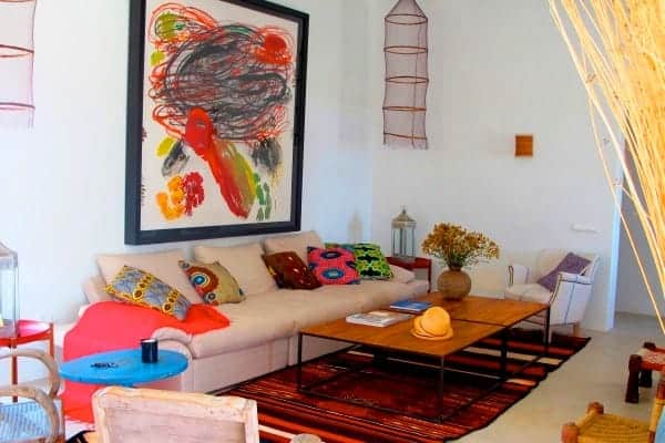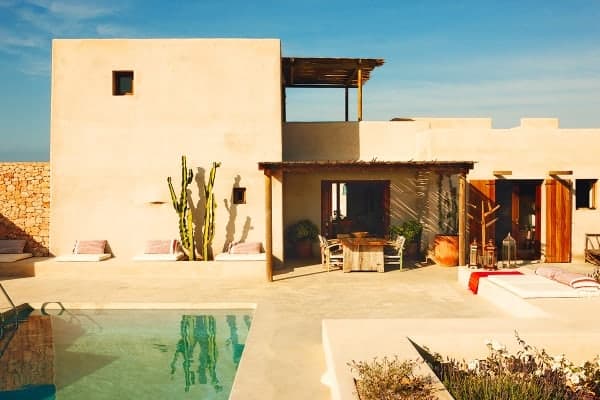 On a plateau that is the highest point of Formentera, is the solitary and luxury holiday home of an international celebrity, which masterfully integrates into its surroundings and commanding 360 degrees of vista out to sea overlooking pine forests, fig and carob trees, dunes and scrub. It is most compelling setting and the villa is within a planned but naturally evolving 18,000 sq. m garden, which is bordered by a perimeter of roses and is home to a swimming pool matching the colour of the turquoise sea beyond. The deliberate, simple and artisan-like quality of this villa makes it a unique addition to the holiday rental market located a mere five minutes by car from the nearest beach (‘Es Calo’). Reached by a dirt road that runs between vineyards, the villa is the dream project of the owner in collaboration with local architects and a top interior decorator. The goal was to create a home that is “powerful and silent, modern but rooted in its vernacular roots, fused with the earth, relaxed”. The succeeded and added a lovely“no decoration” charm to the decor stamped with delightful mix and match of “boho chic”: various fibres, natural and vegetable; Argentine textiles and African rugs on the floors; varicoloured and patterned pillows; local knickknacks and mementos from travels worldwide; woven and sturdy wood furniture, doors without frames or knobs and kitchen set with mod cons. The seeming block composition of the villa from outside belies its distinctive white, modular and cubic interior in which the living spaces effortlessly flow from one to the other, while the living room terrace with its bamboo canopy adds more to the illusion of being in the midst of nature.